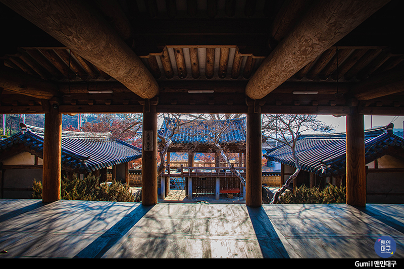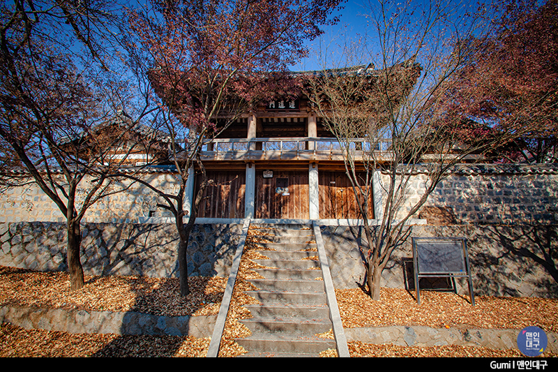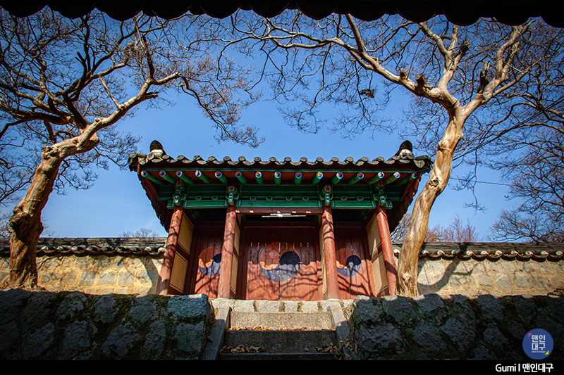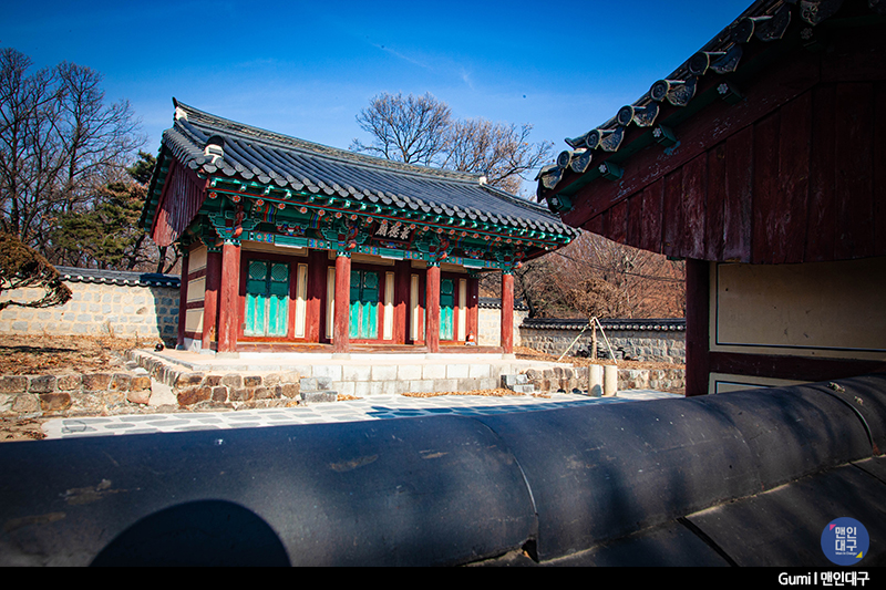이 서원은 조선후기 #여헌 #장현광 선생의 학문과 덕행을 추모하기 위해 건립된 건물이에요. 서원의 구조는 다른 서원과 큰 차이가 없습니다. 400년 된 은행나무(추정) 바로 앞으로 서원의 현관 역할을 겸한 2층 누각이 있고, 서원은 돌담에 둘러쌓여 있어 외부에서는 안을 보긴 힘들어요. 다른 서원과 달리 보수공사를 한지 얼마되지 않았는지, 누각의 기둥과 주변이 깔끔했어요.
