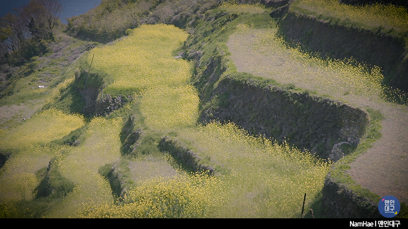 마을 위쪽의 주차장에 주차를 하고 마을 입구로 향했어요. 눈 앞으로 촤~악 펼쳐진 노란 #유채꽃이 끝없이 펼쳐져 있어요. 유채꽃이 끝나는 경계에는 푸른 바다가 펼쳐진 것을 보는 것만으로도 이미 힐링 성공! 유채 꽃이 만발한 다랭이 마을을 천천히 산책해봅니다.