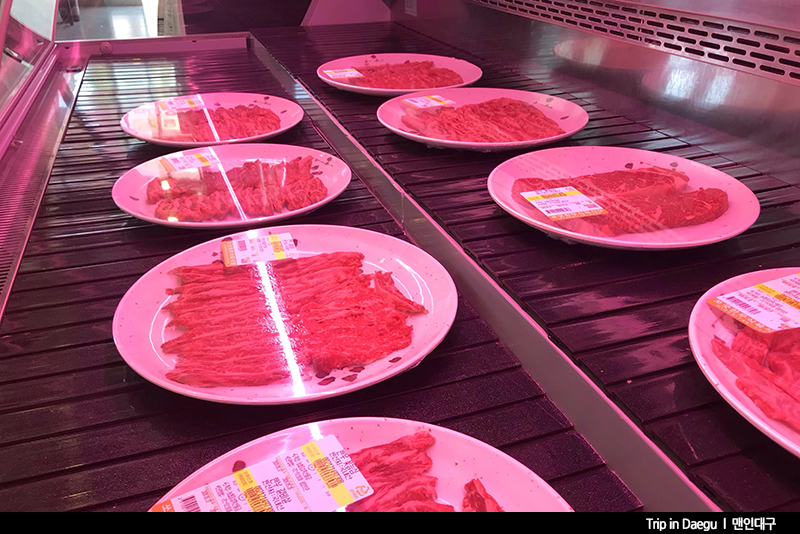 식당 홀 왼쪽 냉장고에 진열된 #소고기접시 부위별로 고기가 담겨 있는데, 고기의 양에 따라 가격이 조금식 달라요. 원하는 부위의 고기를 꺼내 테이블에서 구워 드시면 되요. 숯으로 달궈진 불판 위로 고기를 한 점, 한 점 올려 고기를 굽습니다. 색감 좋죠? 접시에 담긴 고기는 기본 3인분, 추가 주문은 1~2인분으로도 가능해요.