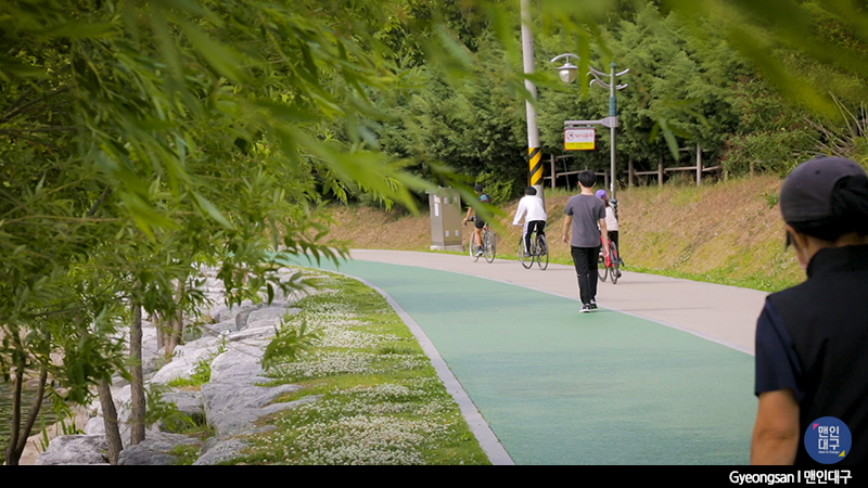 운동을 겸하는 큰 산책로이기에 길 옆으로 자전거길도 함께 만들어져 있어요. 그래서 자전거도 자주 지나다니는 편이에요. 사람이 우선인 길이지만, 가끔 씽씽 지나다니는 자전거에 놀랄 수도 있어요. 자전거를 끌고 오시는 분이라면 산책로에서는 속도를 조금만 줄여주세요:)