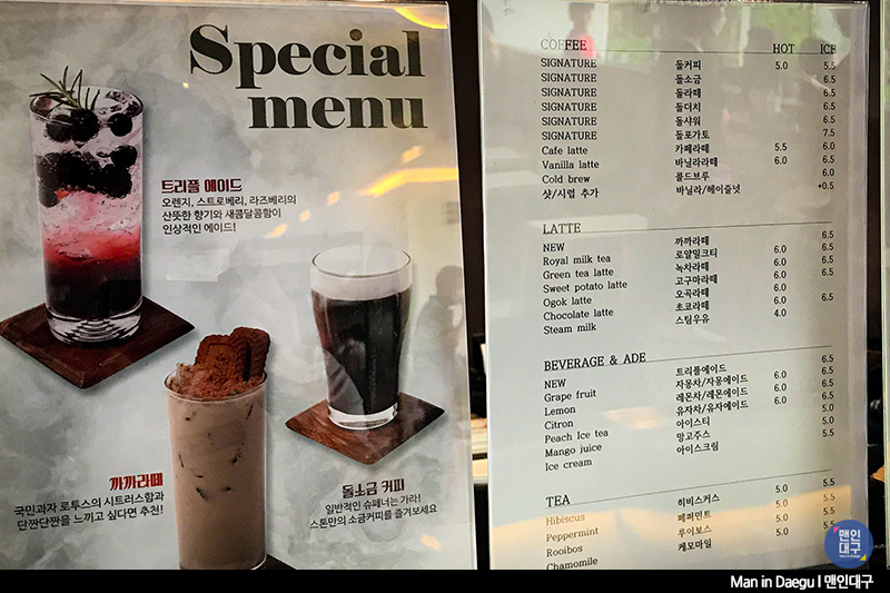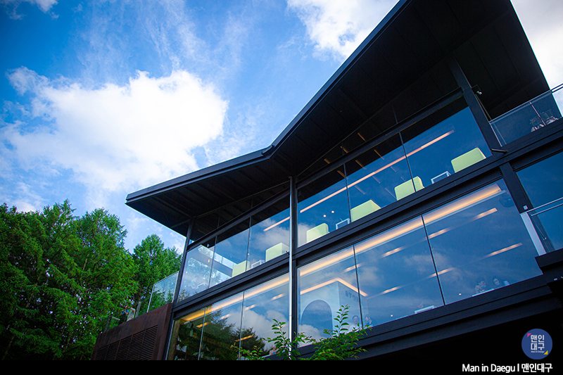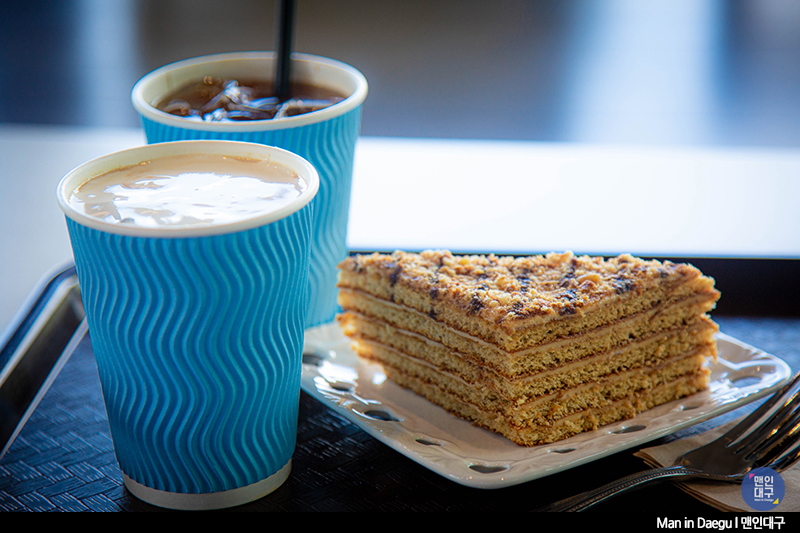저희가 방문한 날은 파란 하늘이 깨끗하게 보이던 날. 방문일 선택을 잘했다는 생각이 들었어요. 통유리 너머 펼쳐진 깨끗한 하늘과 팔공산을 배경 삼아 마시는 커피 한 잔으로 여유만끽. 뷰만 예뻤다면 한 번 방문으로 끝났을지도 모르는데, 커피 맛도 좋아 다음에 또 들르고 싶은 카페예요.