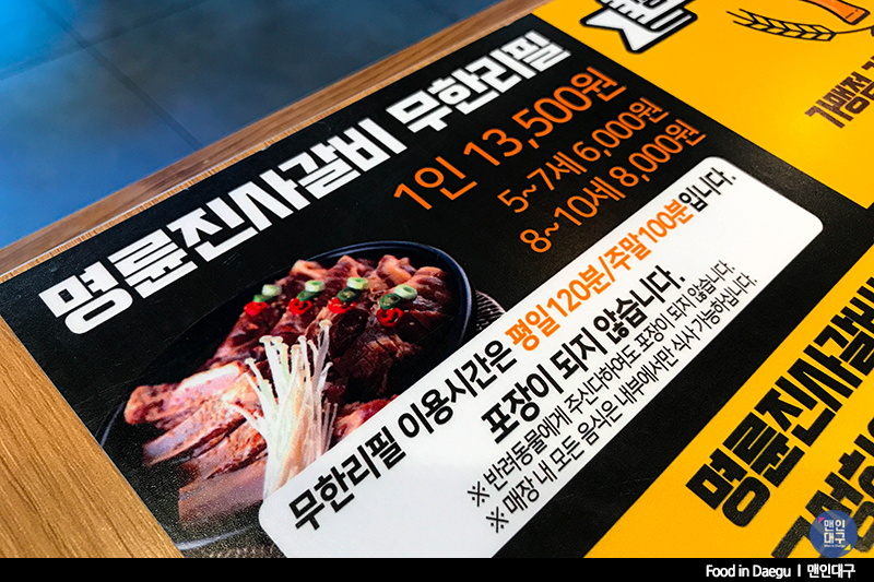 성인 기준 13,500원. 8~10세 8,000원. 5~7세 6,000원. 무한리필 가게의 특성상 식사 시간이 정해져 있죠. 평일 120분(2시간), 주말 100분(1시간 40분). 식사로 두 시간 이상 시간을 소비하는 경우가 잘 없어 저희에겐 적당한 가격과 시간이었죠. 고기를 주문하니 잠시 후 작은 프라이팬에 양념된 갈비가 서빙되었어요.