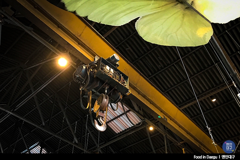 총 3층으로 만들어진 카페에서 가장 큰 공간을 차지하는 #1층. 음료를 받아 들어선 1층 메인 홀은 조금 전 카운터와는 전혀 다른 분위기를 보여줬어요. 높이 솟은 천정에는 예전 공장일 때 쓰던 크레인이 매달려 있고, 홀 곳곳에는 미술품과 전시품이 비치되어 있더라고요. 보는 재미, 둘러보는 재미가 있는 1층이에요. 특히 건물 안쪽 통유리 너머 보이는 나무들은 버려진 폐공장 속에서 피어난 나무는 동화 속에서 볼법한 분위기를 연출해 사진 포인트라는 생각이 딱!