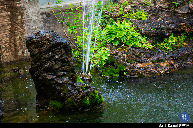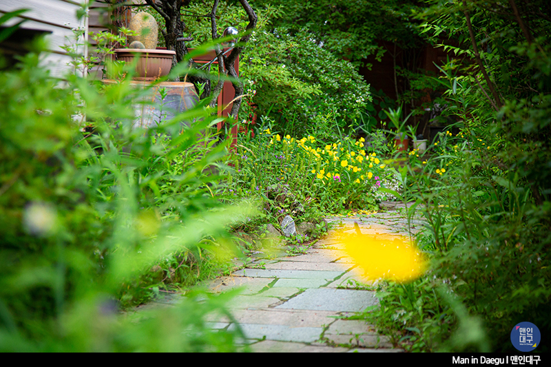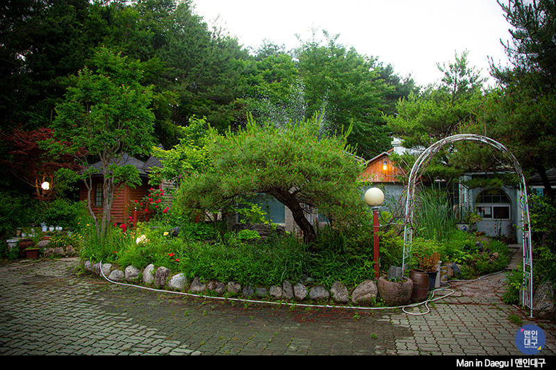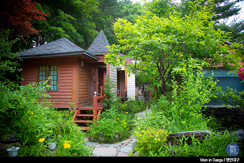 식사만 끝내고 바로 식당을 떠나도 되지만 소화도 시킬 겸 잠깐 식당을 둘러봅니다. 양옆으로 꽃이 핀 길을 따라 방갈로들을 걸어보기도 하고, 흔들의자에 앉아 잠깐 휴식도 취해봤어요. 사실, 그렇게까지 운치는 없지만, 팔공산의 시원한 바람과 공기를 몸으로 느껴보기에 좋은 시간이었답니다.