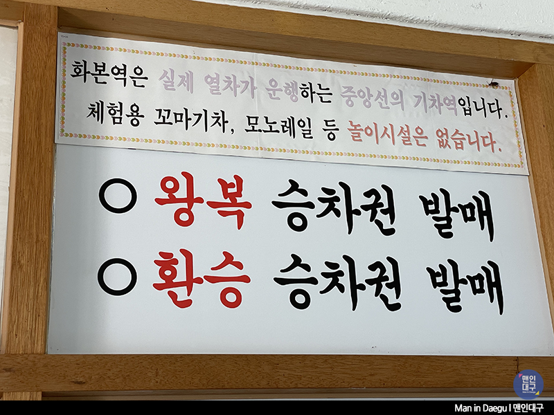 화본역은 실제로 기차가 다니는 간이역이랍니다. 화본역(오전 11시 22분)에서 동대구역(오후 12시 39분)행 무궁화호 기차(4,200원)가 1일 1회 운행 중이며, 돌아오는 기차는 동대구역(16시 30분)에 있다 합니다. 기차 시간은 변동될 수 있으니 이용하실 분은 사전 확인이 필요하셔야 해요. 기차를 이용하지 않더라도 역사에 입장할 때 1,000원을 지불하면 예쁜 화본역 티켓을 받을 수 있답니다.