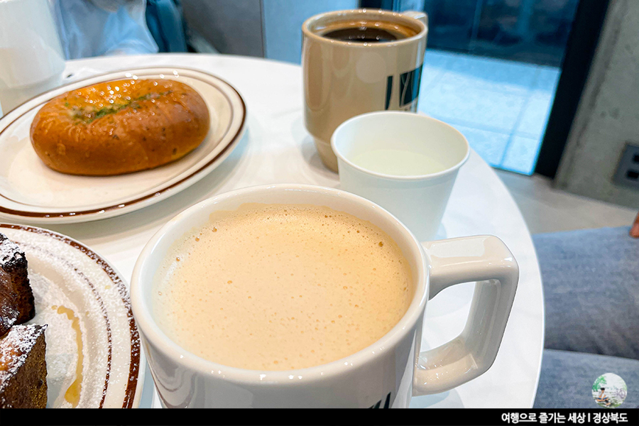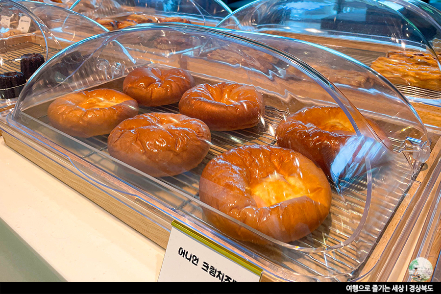 카운터 앞 베이커리 매대에는 갓 구운 빵과