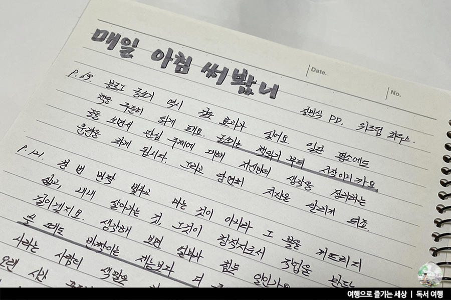 작가님 (지금은 MBC퇴직하셔서 작가님이라 불리셔야겠죠.)의 저자 강연을 다니며 알게 된 작가님만의 블로그 쓰기. 저 역시 블로그를 이전부터 했지만, 작가님을 뵙고 블로그에 글은 어떻게 써야 하는지를 새롭게 알게 되었답니다. 매일 작가님의 블로그에 들어가 작가님의 글을 보고, 저 역시 공부하며 저만의 방법으로 블로그를 꾸렸었어요. 그렇게 두 해 정도 지나고 작가님께서 출간하신 책이 바로 이 책, <매일 아침 써봤니>랍니다.