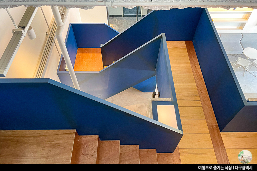 평일 시간대에 방문해 아직 손님이 없어 한적 했던 카페. 덕분에 카페 조금 더 둘러볼 수 있었고, 내친김에 2층 분위기는 어떤지 궁금해 카페 내 계단 따라 올라가 보기로 합니다. 상가 건물 특성상 층고가 높아 2층 가는 계단 생각보다 많아요. 하지만 1.5층쯤에 만들어진 공간에 의자를 둬 포토존을 만들어두는 센스. 무심한 듯 무심하지 않은 센스, 볼 수록 마음에 드는 카페였어요. 참, 거동이 불편하신 분들은 2층 올라오는 엘리베이터 있으니 엘리베이터 이용하시면 된답니다.