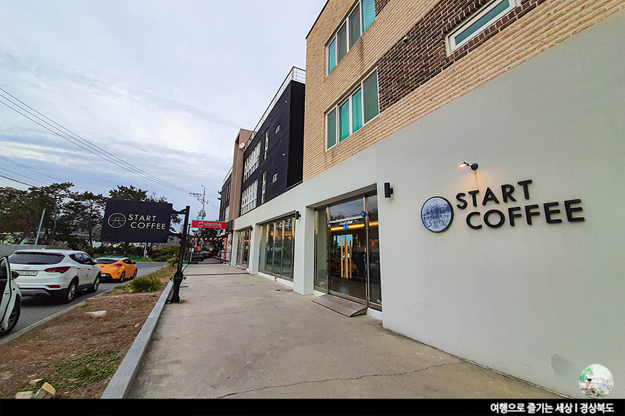 지난 감포 여행 중 잠깐 휴식도 취할 겸 근처 카페를 검색하다 발견한 <스타트 커피>. 오션뷰 카페로 분위기가 좋다해 방문하게 되었어요. 경북 경주시 감포읍 동해안로 1862. 여러 가게가 이어진 건물 중 하얀색의 외관이 눈에 띄어 어렵지 않게 찾을 수 있는 곳이에요. 건물 옆으로 공용 주차장에는 차량 10대 정도 가능. 나중에 찾아보니 카페 바로 옆 식당인 <나정에 가면> 식당이 홍게 라면으로 유명하더라고요. 아쉽게 이번에는 방문 못했는데, 다음에 라면이 생각난다면 방문해봐야 할 듯!