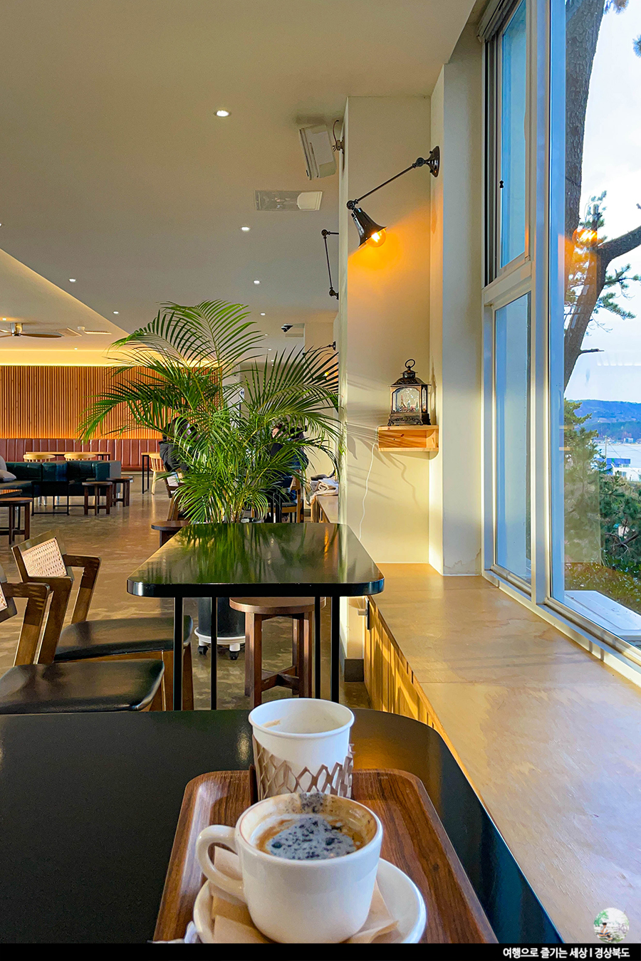 오후 3시쯤 방문한 카페는 한적해 편히 쉬기 좋더라고요. 오렌지빛 조명과 깔끔한 느낌의 가구가 은근 잘 어울렸죠. 통유리 너머 바다가 모두 보이면 좋겠지만, 테이블마다 풍경 조금씩 달라요. 바다가 훤히 보이는 창문도 있고, 소나무가 자라 소나무 사이로 바닷가 마을 모습이 살짝 보이는 등 여러 매력이 있는 카페. 여기에 카페 입구 쪽 창문의 블라인드 사이로 들어오는 햇빛 역시 카페의 분위기를 한 껏 끌어올려줍니다.