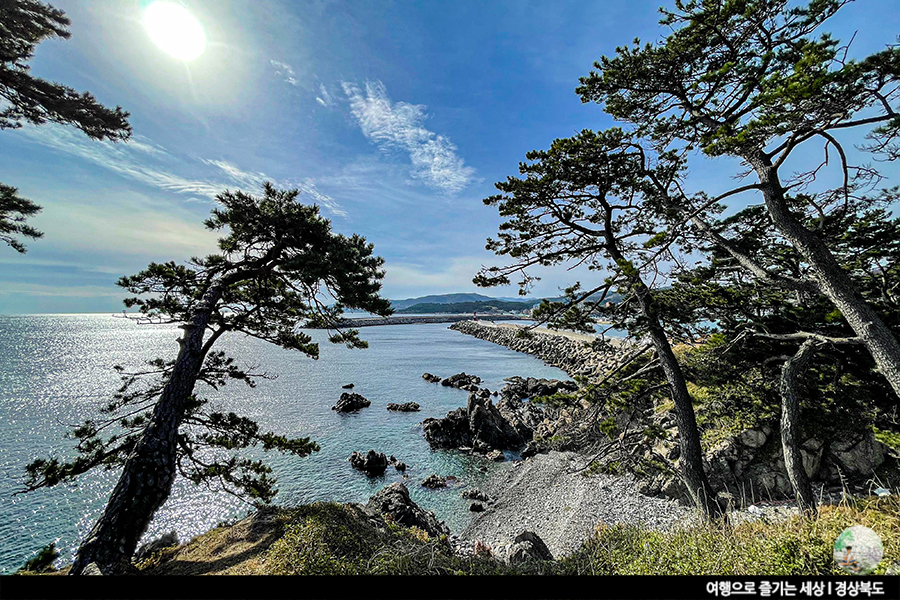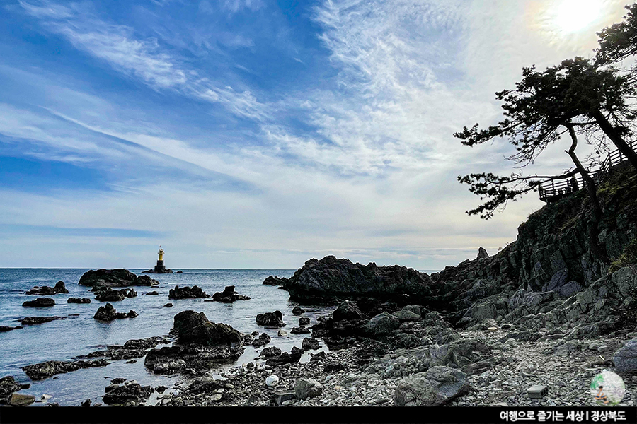 감포항 근처에는 등대가 두 곳이 있어요. 한 곳이 앞서 알려드린 감포항남방파제등대이며 다른 방파제는 바다 건너편에 있는 송대말등대랍니다. 300년 이상된 해송들로 둘러싸인 입구를 통과하면 너무도 청명한 하늘과 바다가 눈앞에 나타남과 함께 우뚝 솟은 하얀 송대말 등대 볼 수 있답니다. 데크를 걸어 보며 바다를 감상하는 것도 좋고, 해안가로 내려와 맑은 감포바다를 조금 더 가까이서 구경하는 것도 좋아요.