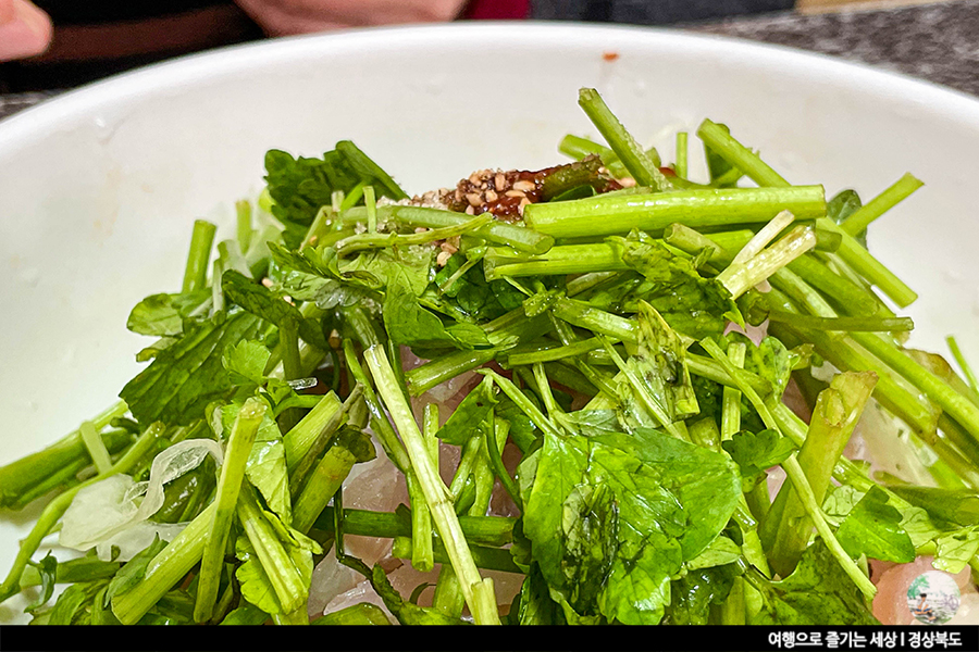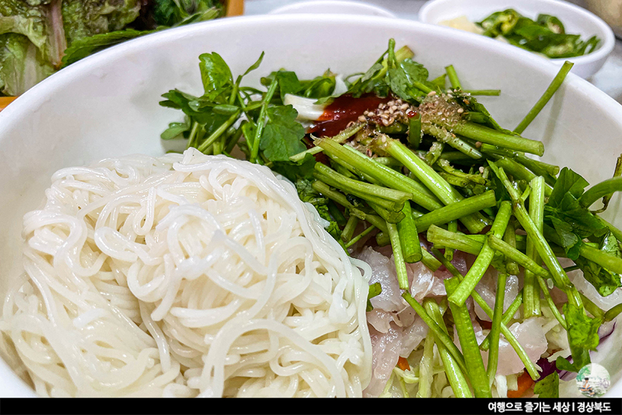 동해 바다를 왔다면 식사로 신선한 해산물이나 회를 빠뜨릴 수 없죠. 감포항 근처에서 먹어도 좋지만, 별미를 드시고 싶다면 전촌리 할매횟집 추천드려요. 감포항에서 차로 5분 거리에 떨어진 할매횟집의 대표 메뉴는 회국수&횟밥. 탱탱한 면발에 하얀 윤기가 가득한 소면과 파릇한 녹색빛의 신선함이 가득한 미나리가 듬뿍 올려진 회국수는 정말 엄지 척! 회국수 보다 가자미회의 양이 훨씬 많아 바다의 향을 제대로 느낄 수 있는 횟밥의 매력에 빠져 볼 수 있답니다.