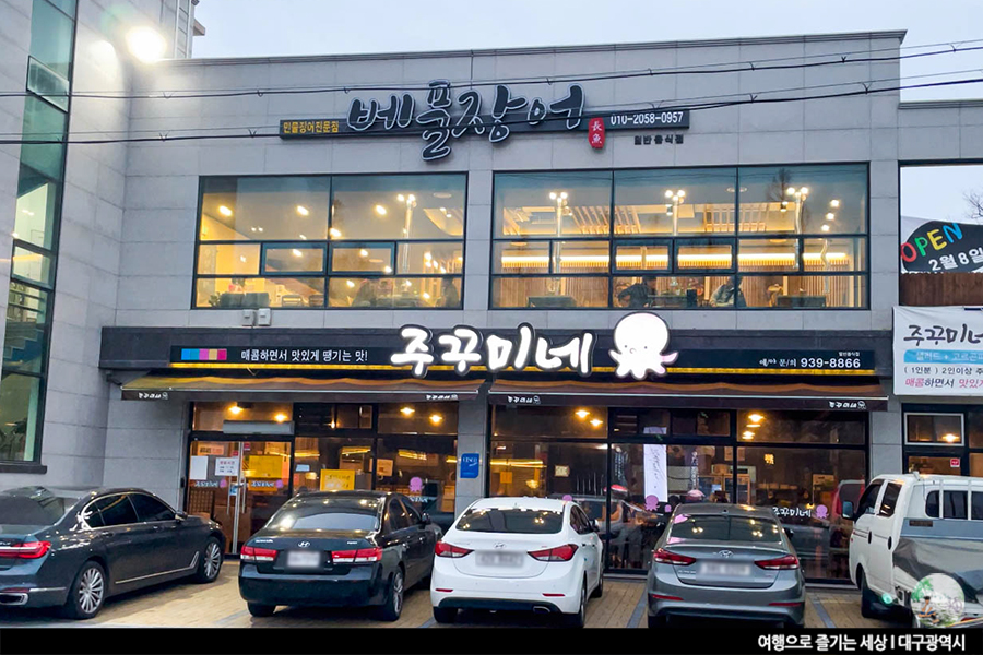 가족, 연인들의 산책, 데이트 코스로 많이 찾는 대구 동구 동촌유원지. 특히, 이 주변은 맛집이 많아 자주 방문하는 장소 중 한곳이에요. 그 중 오늘 소개해 드릴 곳은 <쭈꾸미네>. 매콤한 쭈꾸미와 함께 달달한 고르곤졸라 피자를 함께 먹을 수 있는 특색있는 맛집으로 동촌유원지의 유명 맛집 중 한 곳이랍니다.