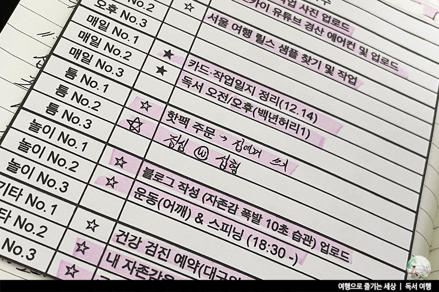 글을 읽다 보니 이것 역시 버킷리스트를 이루는 방법이라는 생각이 들었어요. 버킷리스트를 만들었지만, 세부적인 계획을 세우기는 솔직히 매우 힘들어요. 하지만 이런 작고 소소한 일들이 하나씩 모이다 보면 어느새 버킷리스트를 이룬 적 꽤 있더라고요. 저 역시 몇 년간 To Do List를 작성해 하루 해야 할 일정들을 정리하곤 합니다.