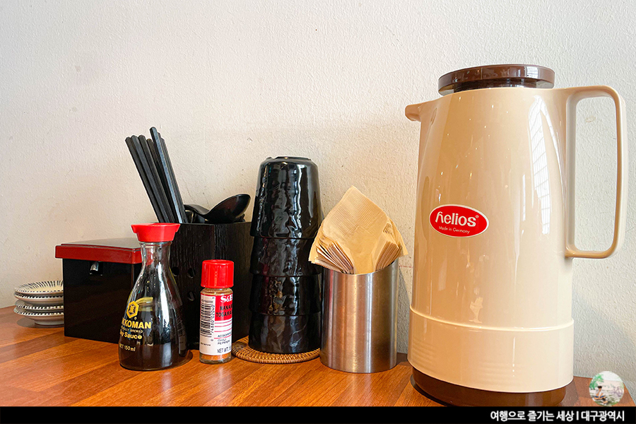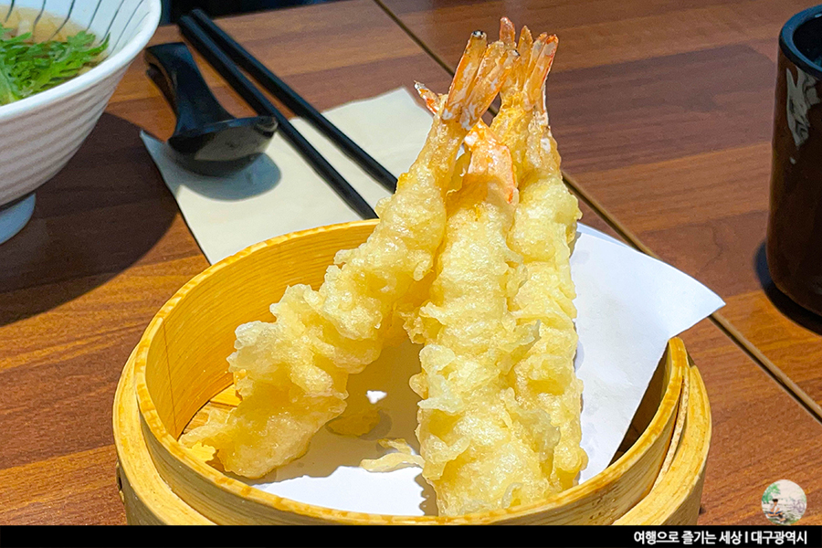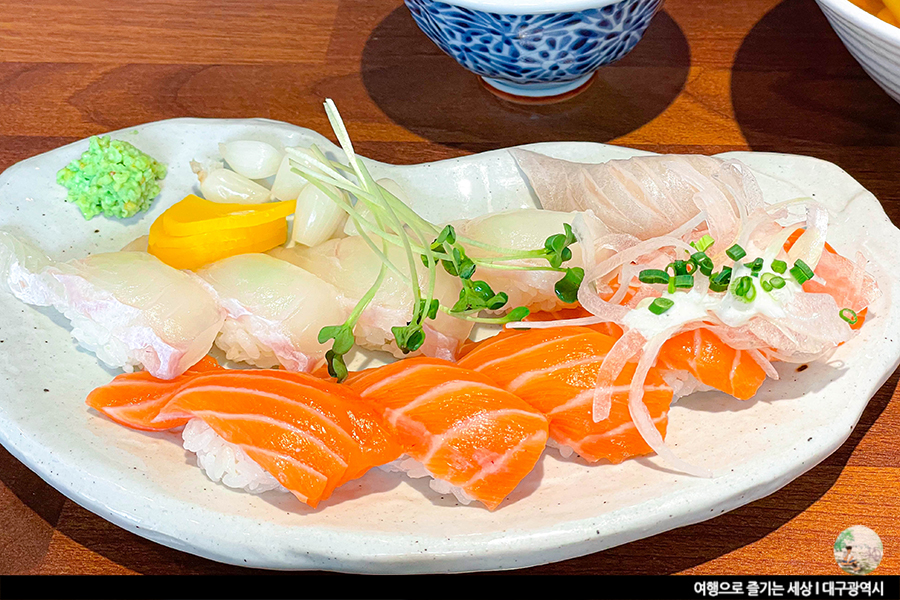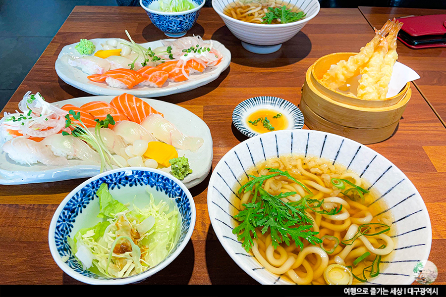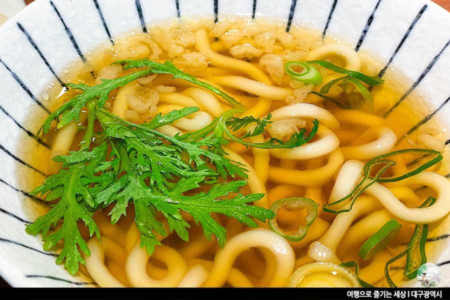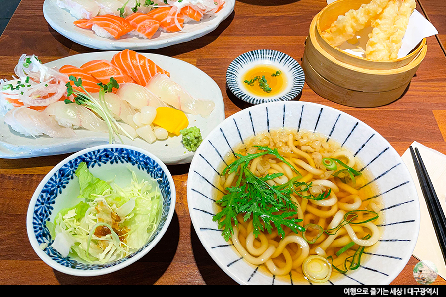 단품 세트 상관 없이 모든 메뉴에는 미니우동과 샐러드가 포함되어 있어요. 사실 말이 단품이지 알찬 구성인 세트와 마찬가지예요. 거기에 가격들도 그렇게 높지 않아 가성비 좋다는 소문이 자자한 대실역 초밥집 다정한 초밥. 신선한 양상추의 샐러드도 좋지만, 이 집의 미니우동 맛을 좋아해요. 국물이 짜지도 않고, 적당히 간이 되어 부담 없이 먹기 좋은 미니우동이예요. 적당한 간장베이스에 쑥이 올려진 미니우동. 개인적으로 쑥이 올려진 우동을 정말 좋아하는데, 조만간 서문시장에 방문해 우동 한 그릇하고 와야겠어요.