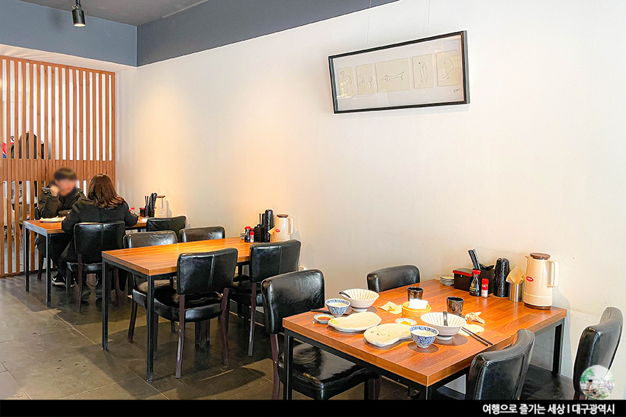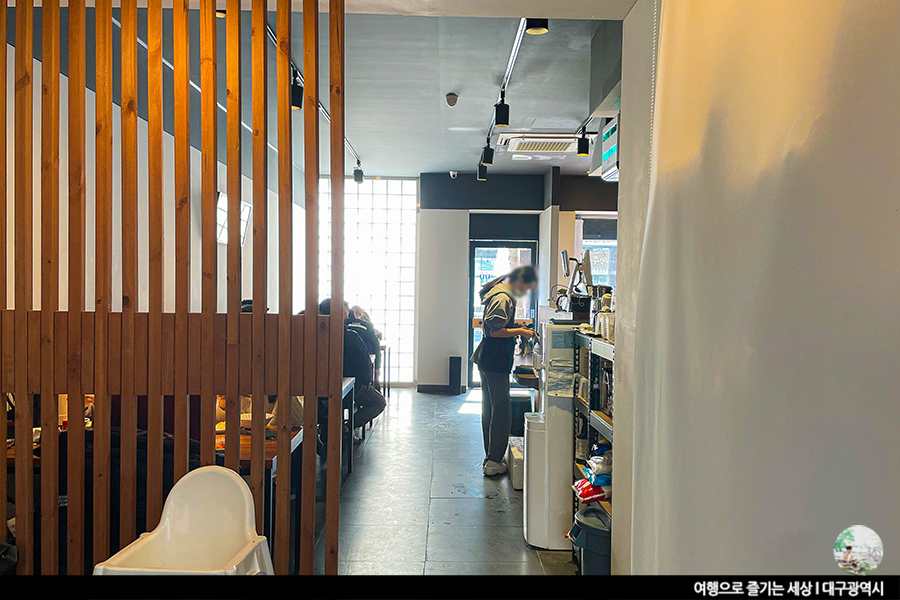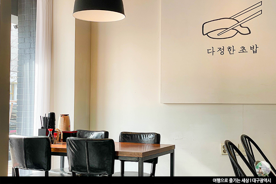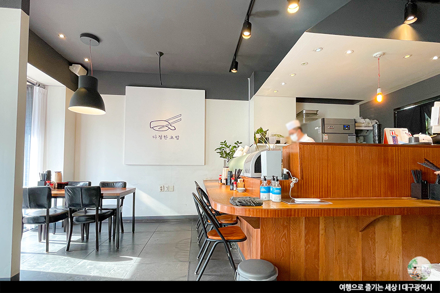 달성군 데이트 코스로 괜찮은 식당인 다정한 초밥은 4인석 테이블 4개에 'ㄱ'자 바가 있는 작은 식당이에요. 테이블 수 그렇게 많지 않아 대기해야 할 수도 있다는 점. 오픈식 주방으로 요리사분이 초밥을 만드는 것을 바로 볼 수가 있어요. 그만큼 신선도와 믿음으로 가게를 운영한다는 말이겠죠? 흰색과 짙은 회색의 내부 색감에 우드톤의 테이블이 더해진 이곳, 깔끔하다는 생각이 절로 들어요. 심플함까지 더해져 더 자주 오고 싶은 곳이기도 해요.