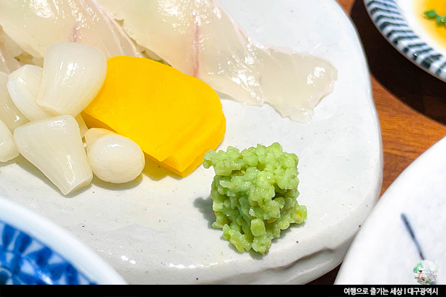 신선한 윤기가 반들한 광어와 연어초밥에 입에 침이 고입니다. 회는 좋아하지 않아도 초밥 좋아하는 분들 많죠? 와사비를 적당이 올려 간장에 톡 찍어 초밥을 한 입에 넣습니다. 잠시 후 와사비의 찡함이 코끝으로 몰려옵니다. 눈물이 쏙 날 것 같지만, 다행히도 눈물은 나지 않네요. 생와사비는 조금 더 강한 만큼 자신에게 양을 맞춰 와사비를 올려 먹는 것 중요해요!