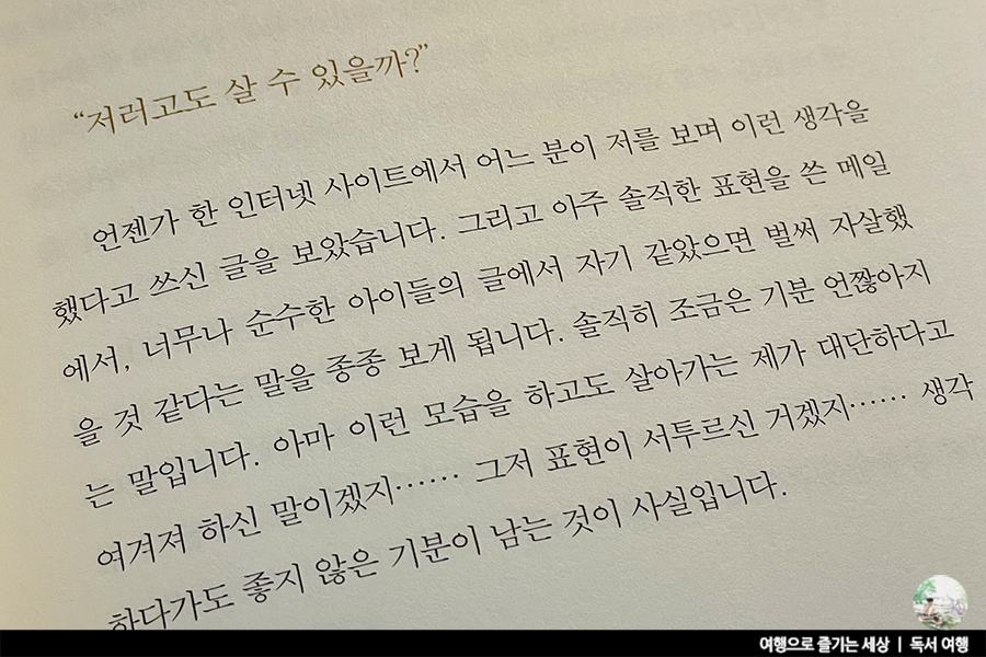 그 누구도 그 어떤 삶에도 '죽는 게 낫다'는 판단은 옳지 않습니다. 힘겹지만 오늘의 소중함을 알고 오늘을 살아내는 인생을 뿌리째 흔들어 밟는 그런 생각은, 말은 옳지 않습니다. 틀렸다고 분명히 말하고 싶습니다.