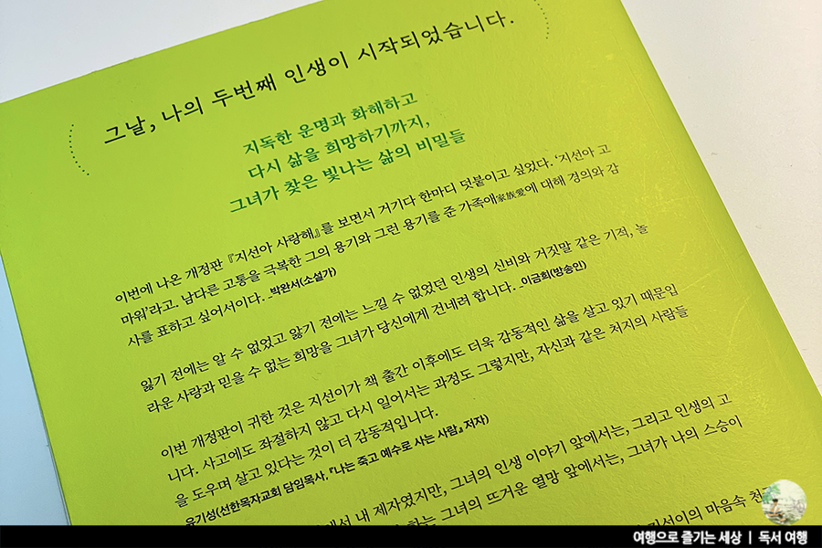 누구에게나 사고는 발생할 수 있고, 누구에게나 가슴 일이 발생할 수 있어요. 하지만 그 상황을 어떻게 극복하느냐는 자신과 주변의 도움으로 극복할 수 있다는 것을 책을 통해 다시 한번 알게 되었어요. 마지막 책장을 덮으며 저는 이지선 저자가 대단하다는 생각이 들었어요. 그리고 누군가에게 희망의 빛이 되어주고 있는 저자의 모습에 저 역시 힘을 냅니다.