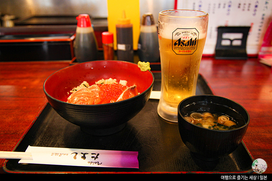 신선한 회와 알이 들어간 덮밥을 시켰어요. 와사비를 살짝 올려 밥과 생선을 한 입 가득 넣어 봅니다. 코끝이 찡해지면서도 신선한 생선의 맛에 엄지가 척!