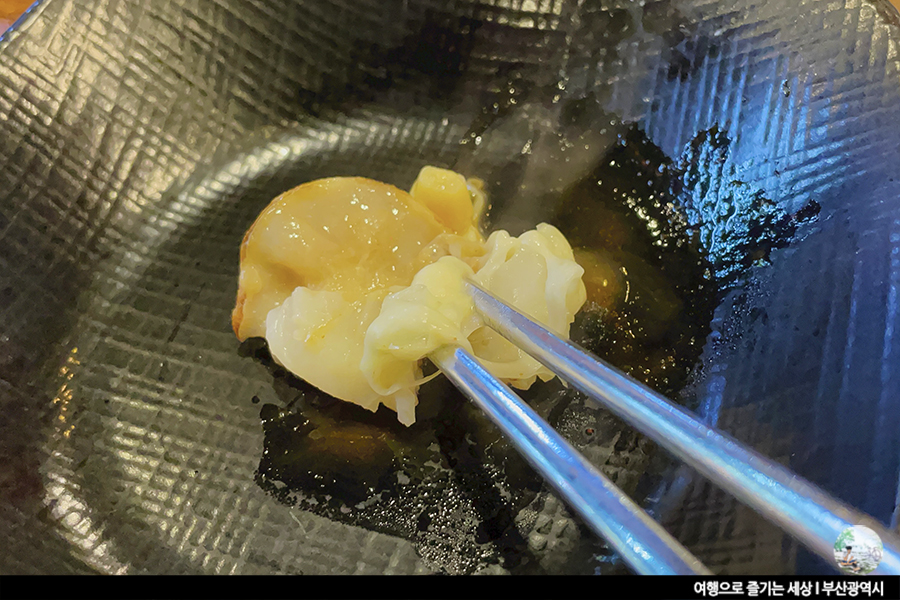 떼어 내 조개를 한 입 쏙 넣어봅니다.