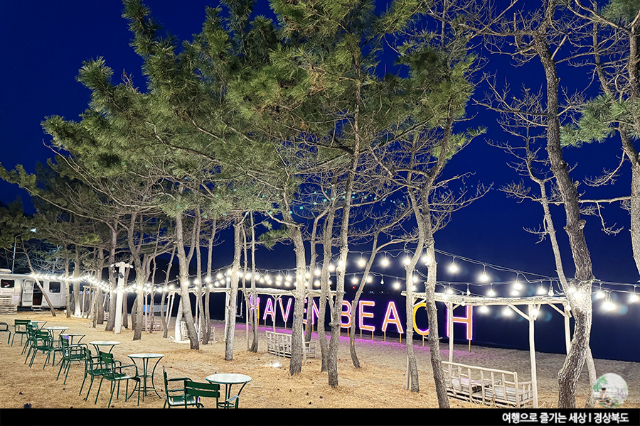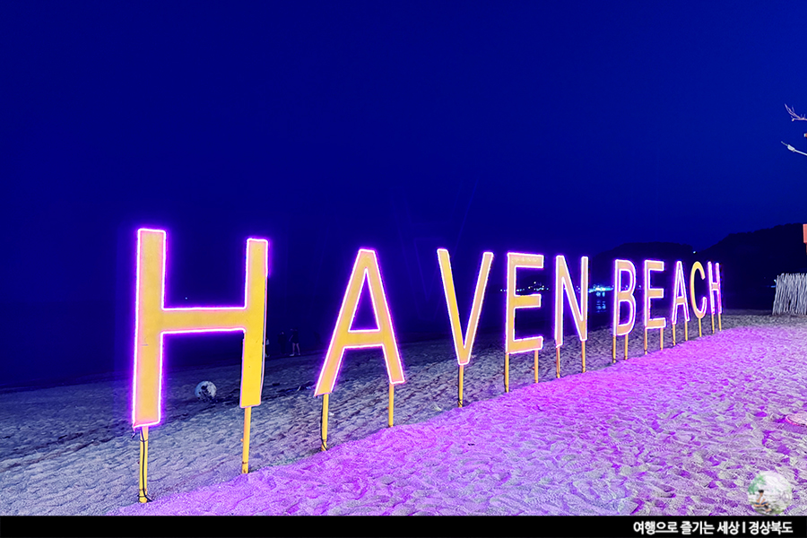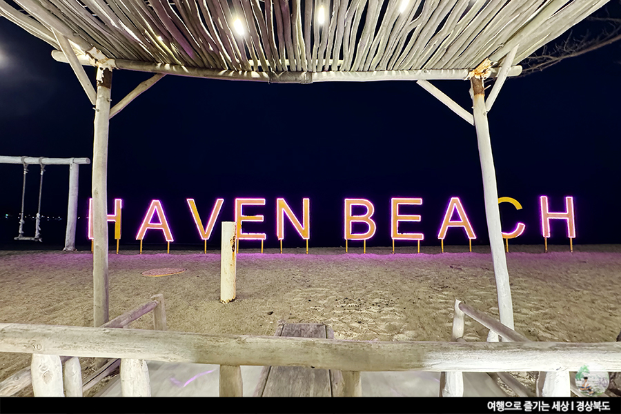 사실 밤바다는 오징어배 불빛이 아니면 볼 것 없을지도 몰라요. 그런 해변가를 펜션 앞에 세워진 조형물들이 분위기를 더해줬어요. 곳곳에 꾸며둔 조명과 헤이븐 비치라 적힌 네온 간판까지. 감성적인 분위기 내기엔 딱 좋은 곳이군요.