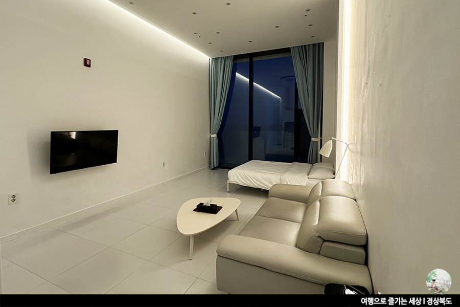 조금만 일찍 도착했다면 야외 벤치에 앉아 커피 한 잔의 여유 즐겨봤을 거예요. 하지만 이미 저녁시간이 되어 해변가는 잠깐만 둘러보곤 객실로 올라왔답니다.