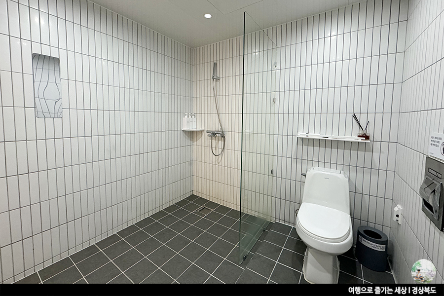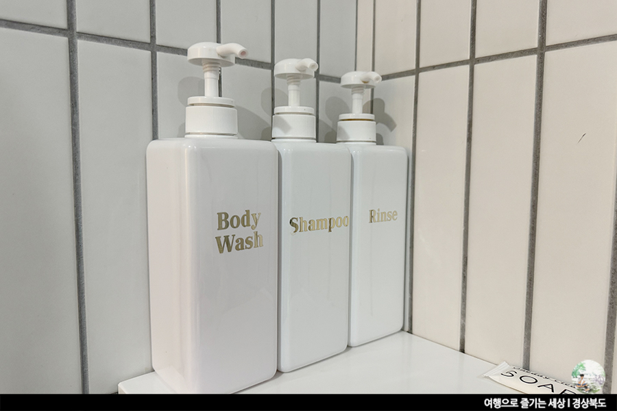 화장실엔 기본적인 세안도구와 위생용품이 비치되어 있습니다. 간단한 세안이면 되는 분들에겐 세안용품 없어도 씻는데 전혀 문제없을 것 같아요.