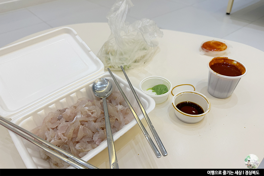 숙소 주변에 식당이 없어요. 치킨 집 딱 한 곳만 배달이 되더군요. 숙소 앞에 편의점이 있어 간단한 요기거리는 할 수 있어요. 하지만 바다에 왔는데 회를 먹어야겠어요. 그래서 숙소에서 10km 정도 떨어진 구룡포항까지 가서 회를 사 왔어요. 자리에서 즉시 잡아주신 가자미회 일품입니다.