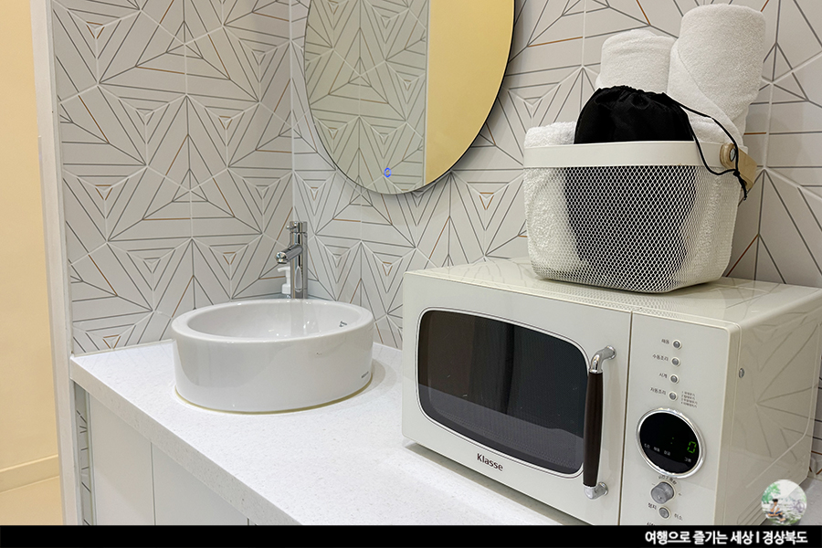 화장실을 나오는데 세면대를 보곤 잉? 하며 다시 세면대를 쳐다봤어요. 세면대 옆에 전자레인지 있더라고요. 아마 인덕션 쪽에 전자레인지를 놓을 공간에 없어 이곳에 뒀나 봐요. 여행에서 가장 유용히 쓰이는 녀석이죠.