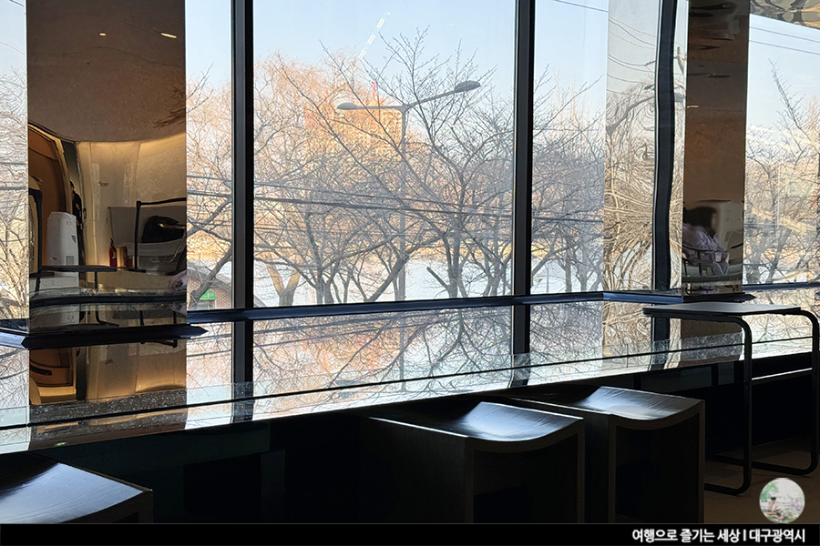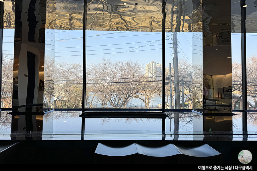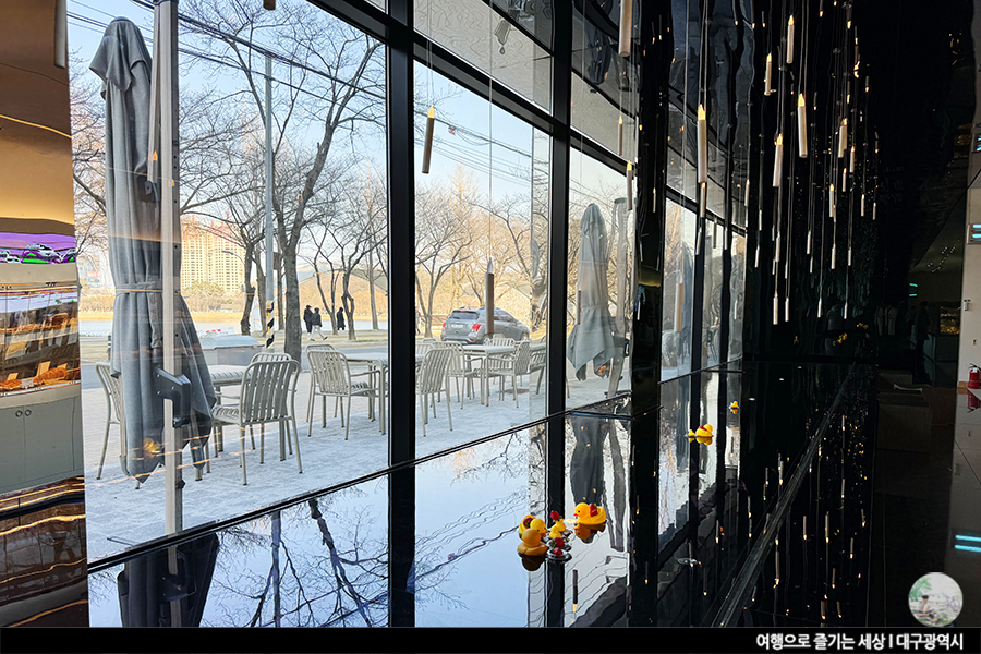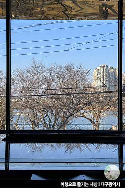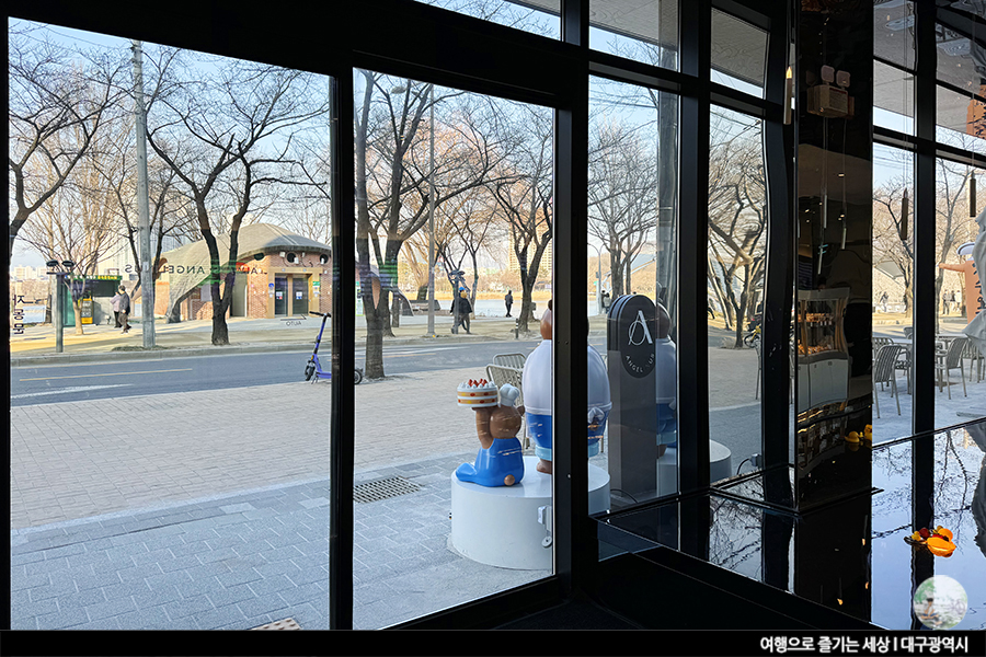대구 가볼만한 곳으로 꼽히는 수성못이 카페 앞으로 보여요. 이렇게 수성못뷰를 볼 수 있는 식당과 카페는 언제나 핫플이에요.