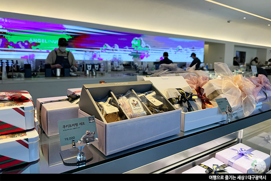 1층 매장 길게 이어진 매대가 눈에 들어옵니다. 디저트부터 베이커리까지 기존 엔젤인어스에서는 보기 힘든 종류의 메뉴가 많았어요.
