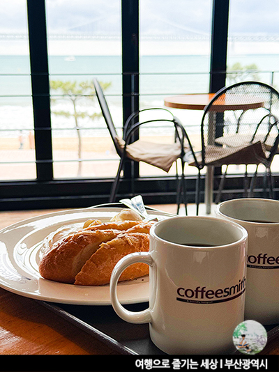 부산광안리 1박 2일 여행을 다녀왔습니다. 전 날밤, 오랜만에 들른 우리포차에서 대방어를 맛있게 먹고 아침은 호텔 조식으로 가볍게 해결했어요. 체크아웃을 준비하다 문득 바다가 보고 싶어졌어요. 그래서 광안리 바다 앞 카페인 <커피스미스 광안게스후점>를 방문합니다.