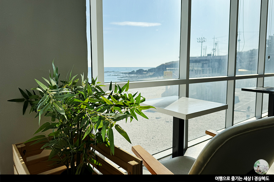 커피를 받아 창가자리에 앉아 봅니다. 구룡포 해수욕장의 파란 하늘과 바다, 그리고 하얀 모래사장이 너무 예쁘더라고요. 보고 있는 것만으로 힐링 되는 곳이에요.