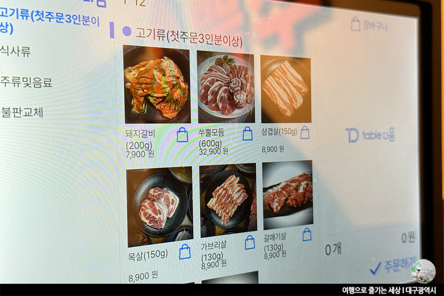 요즘 키오스크 주문은 어딜 가나 쉽게 볼 수 있죠? 쑤뿔갈비 역시 메뉴 주문과 불판교체까지 모두 키오스크로 하면 되더라고요. 먹고 싶은 고기 주문하려는데, 고기 가격이 참 착하더라고요.