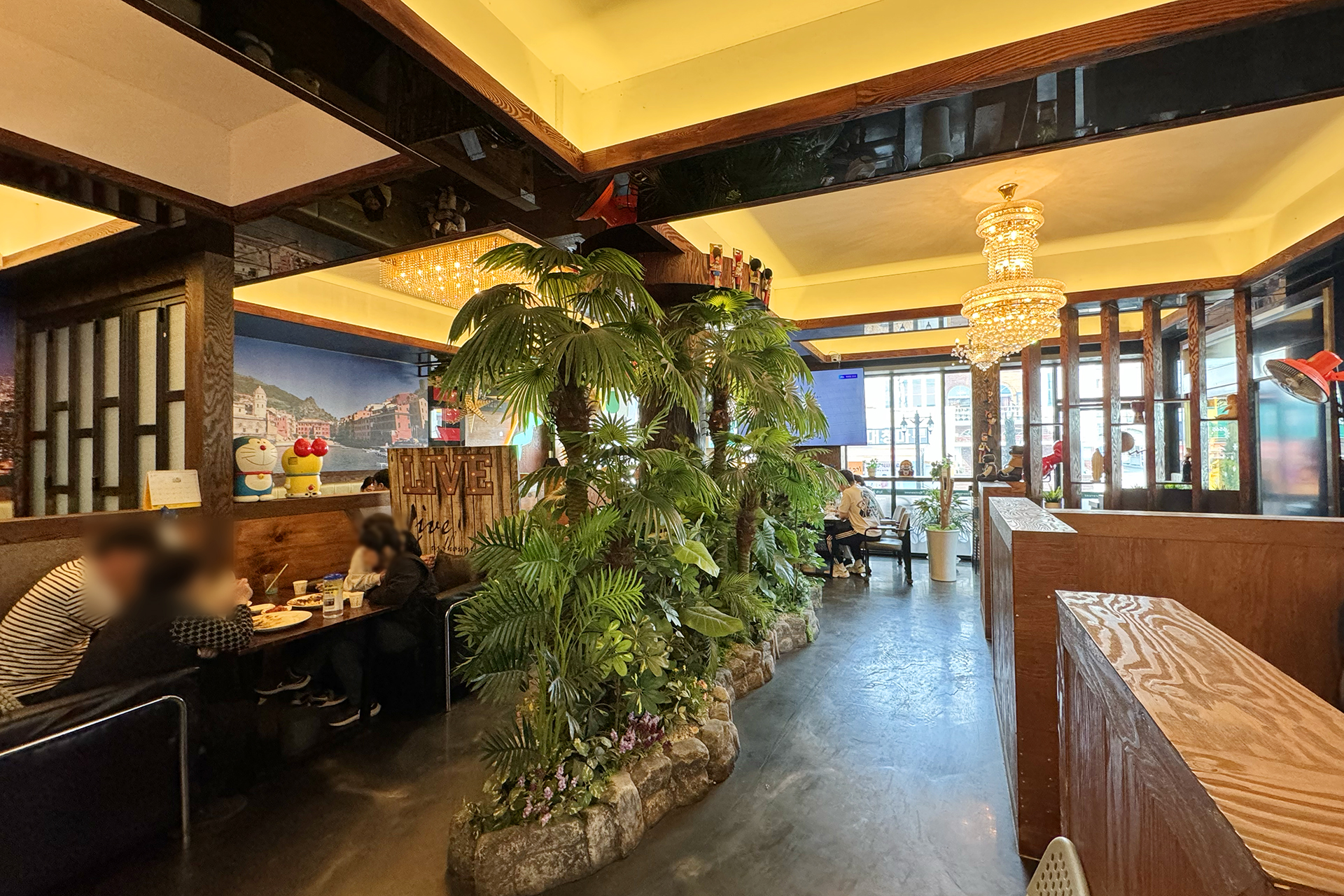 메뉴가 나오기 전 잠깐 식당을 더 둘러봅니다. 어릴 적 잘 살던 친구 녀석 집에서 보던 샹들리에 스타일의 전구도 보이고요, 창 밖으론 작은 정원이 보이더라고요. 예전엔 정원이 달린 단독주택에서 살던 게 꿈이었는데요, 요즘은 아파트가 너무 편해요. 아파트 생활을 벗어나지 못할 것 같아요.