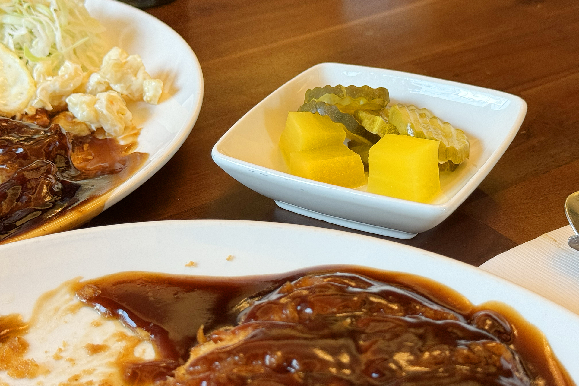 김치도 좋지만, 입안의 상콤함을 더해줄 단무지와 피클도 빠질 수 없는 돈가스의 단짝이에요.