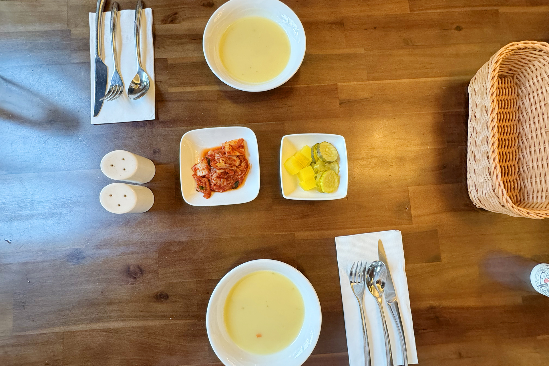 잠시 후 사장님께서 수프와 함께 기본 찬을 가져다주셨어요. 하얀 접시에 노란 수프, 예전 어릴 적 집에서 어머님께서 돈가스를 만들어주실 때 이렇게 주셨던 기억이 났어요.