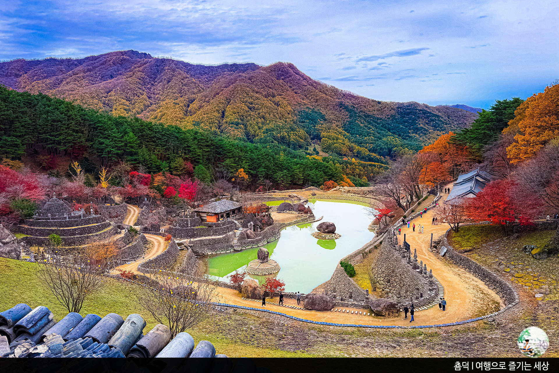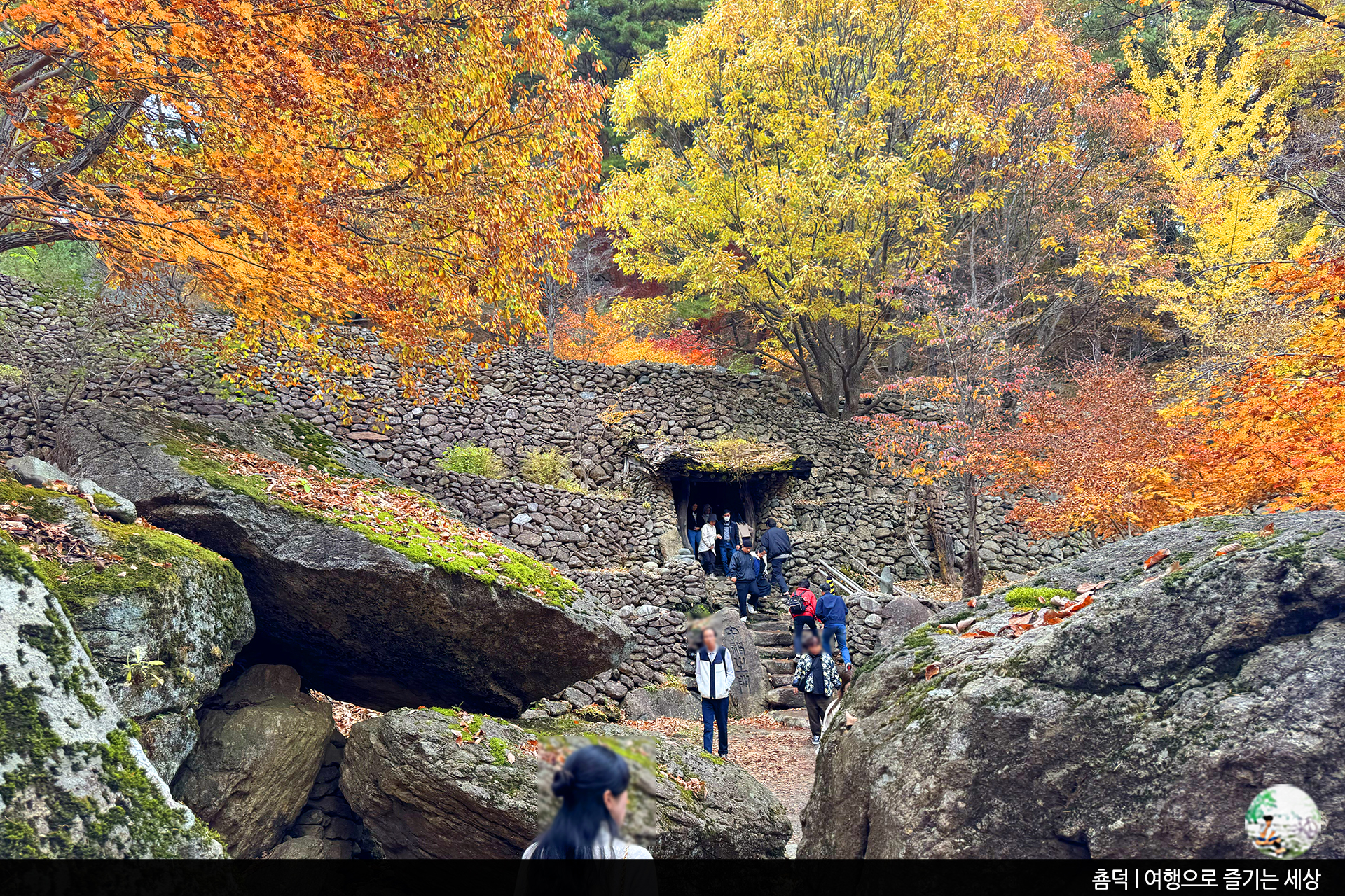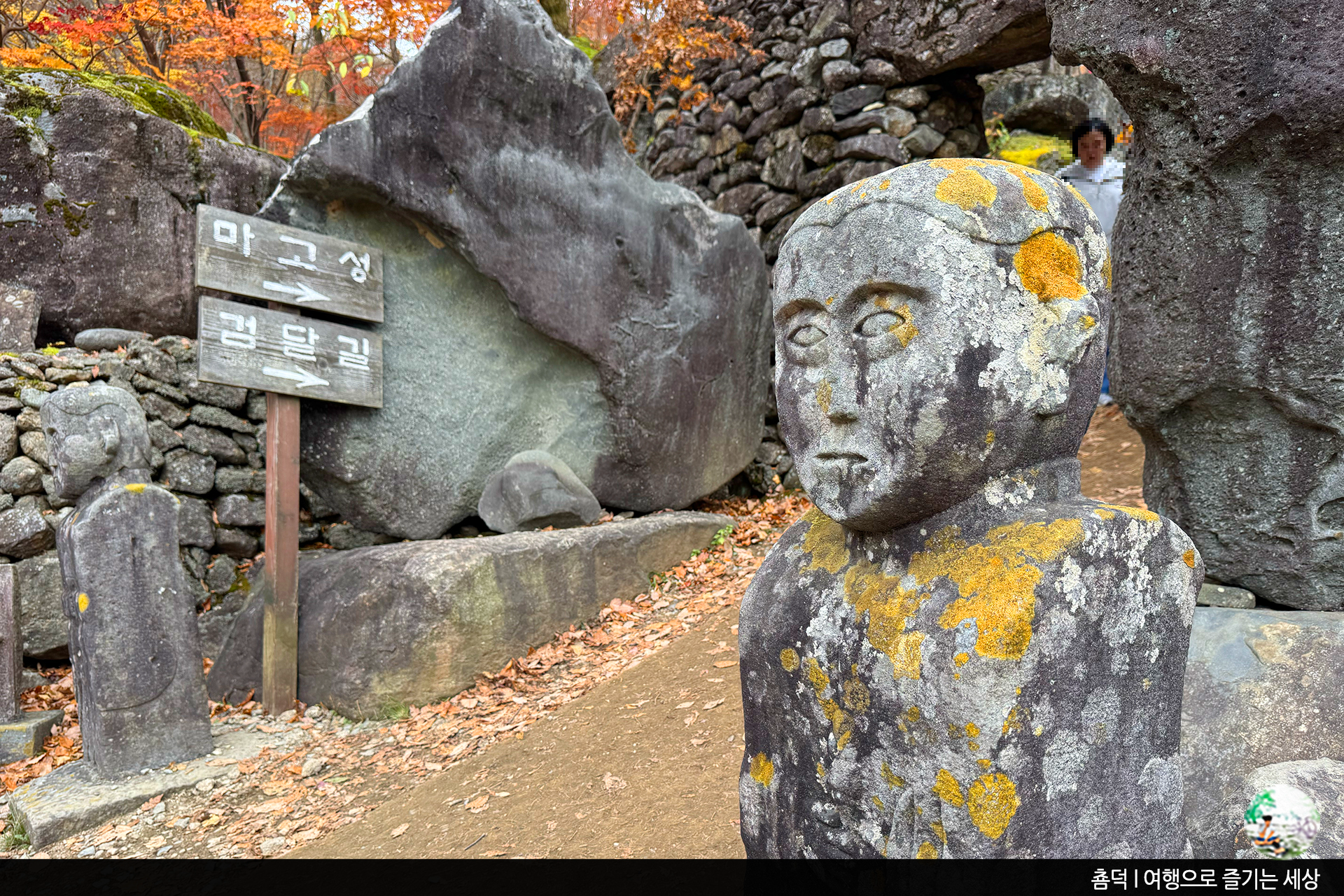 오랜 기다림 끝에 겨우 삼성궁에 입장했습니다. 가을이 한껏 깊어진 삼성궁의 내부는 정말 예뻤어요. 멋드러지게 쌓아둔 돌담과 조각들이 산 하나를 둘러 만들어져 있었거든요. 산을 천천히 돌아 삼성궁을 돌아봅니다.