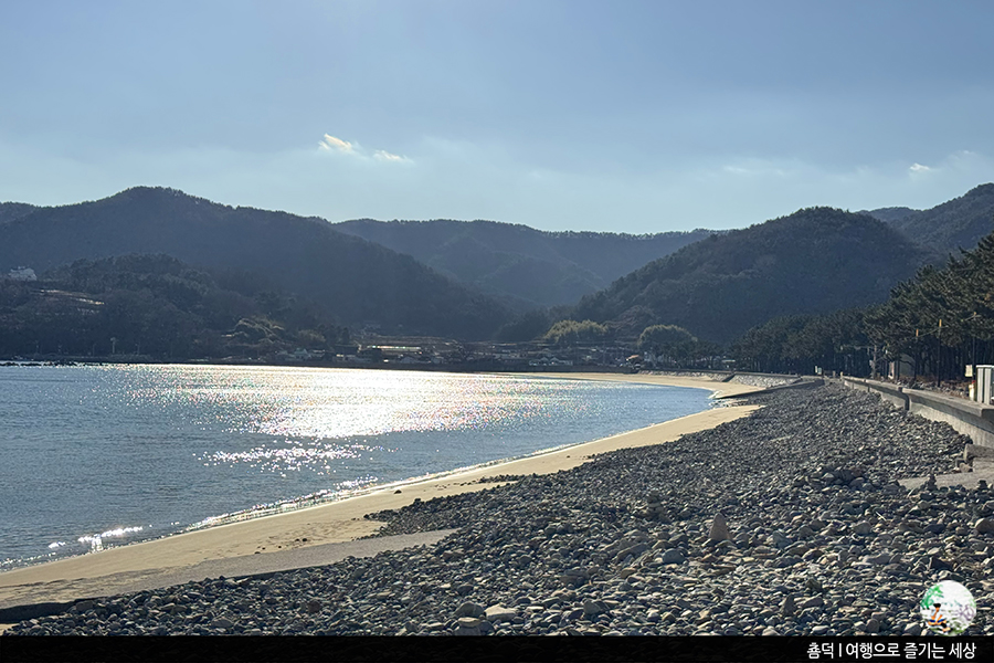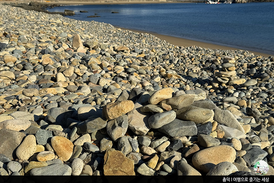 둥근돌이 가득한 겨울철 두곡해수욕장은 방문객이 없어 조용했지만, 저희 부부는 이런 바다 좋아해요. 뭔가 심심하면서도 은근 시간이 잘 가거든요. 굳이 액티비티를 찾지 않아도 괜찮아요. 예쁜 풍경을 보며 산책하는 시간만으로도 이미 기분 좋은 여행이었답니다.