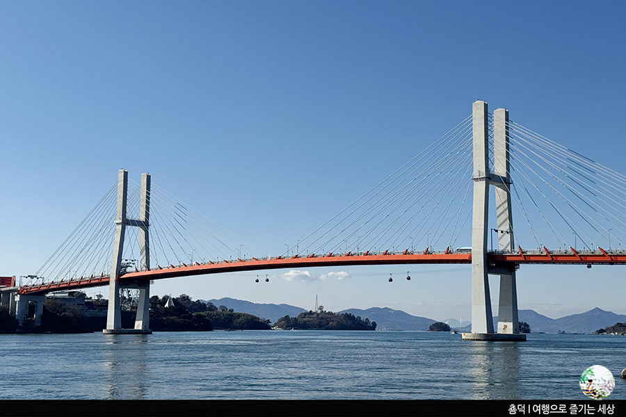 대방진굴항에서 보이는 사천의 명소인 사천대교가 웅장한 모습으로 바다 한가운데 서 있었어요. 사천대교뿐 아니라 사천 바다케이블카까지 보일 정도로 날씨가 좋았던 이날. 덕분에 멋진 사천대교의 모습을 배경 삼아 사진을 실컷 찍을 수 있었답니다.