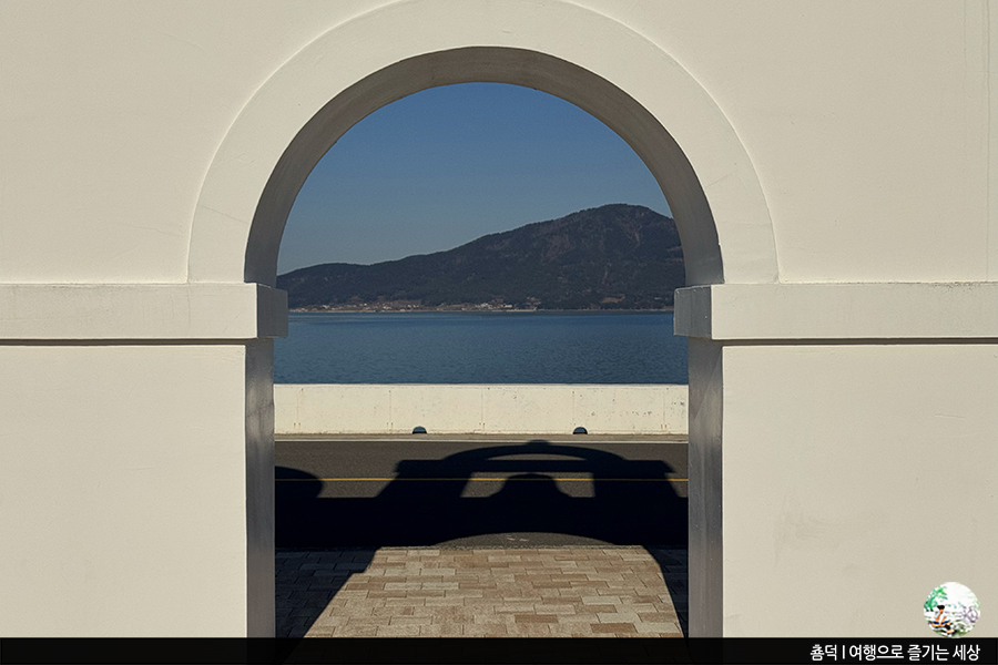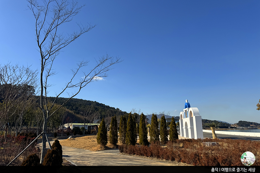 남해바다정원의 메인 포토스팟은 바로 이곳이다. 바로 이 모습이 담긴 남해의 사진을 찍으러 여행객들이 방문하는 곳이기도 하다. 산토리니가 생각나는 화이트&블루톤의 종이 달린 건축물이다.