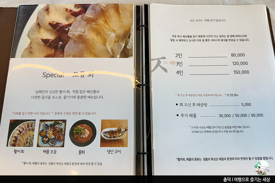 사천 맛집 제주할망횟집 메뉴는 모둠회와 해산물 등 종류로 나눠졌다. 가장 많이 먹는 것이 해물모둠세트나 모둠회라는데, 모둠회를 먹어도 해산물이 기본적으로 조금 나온다는 말에 우린 회를 선택했다.