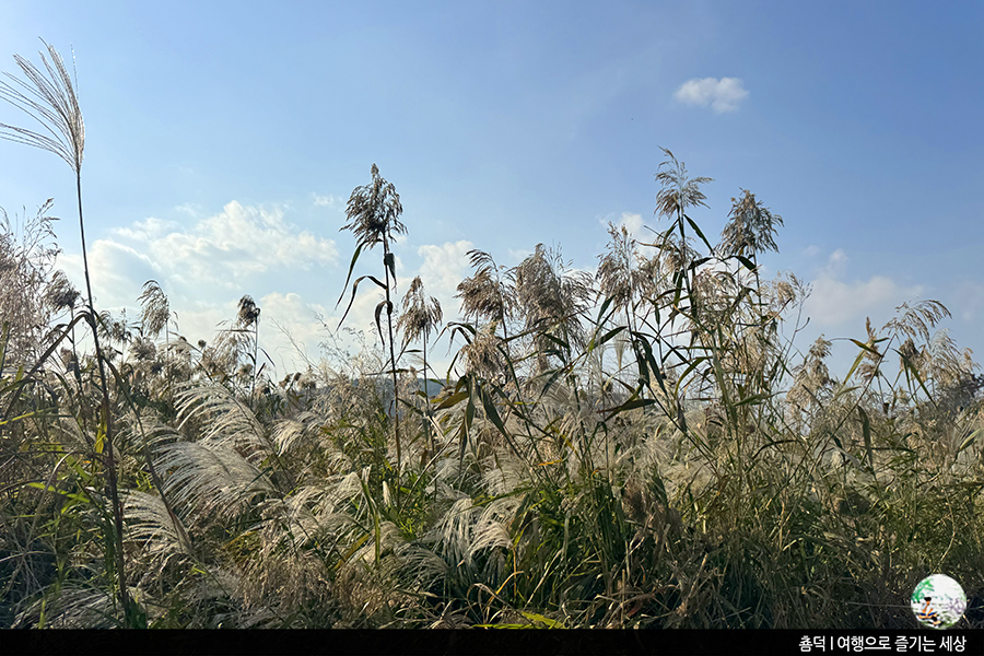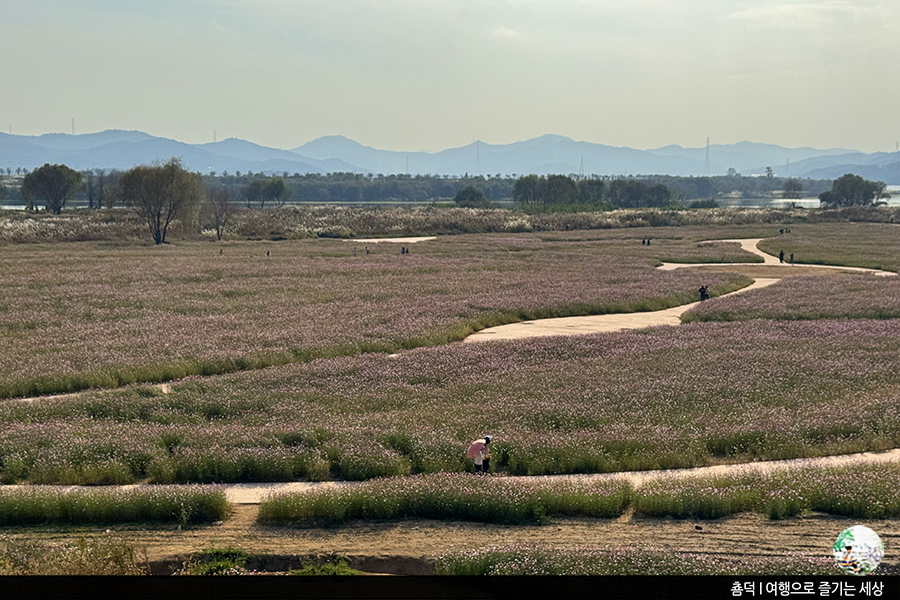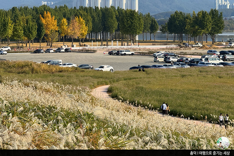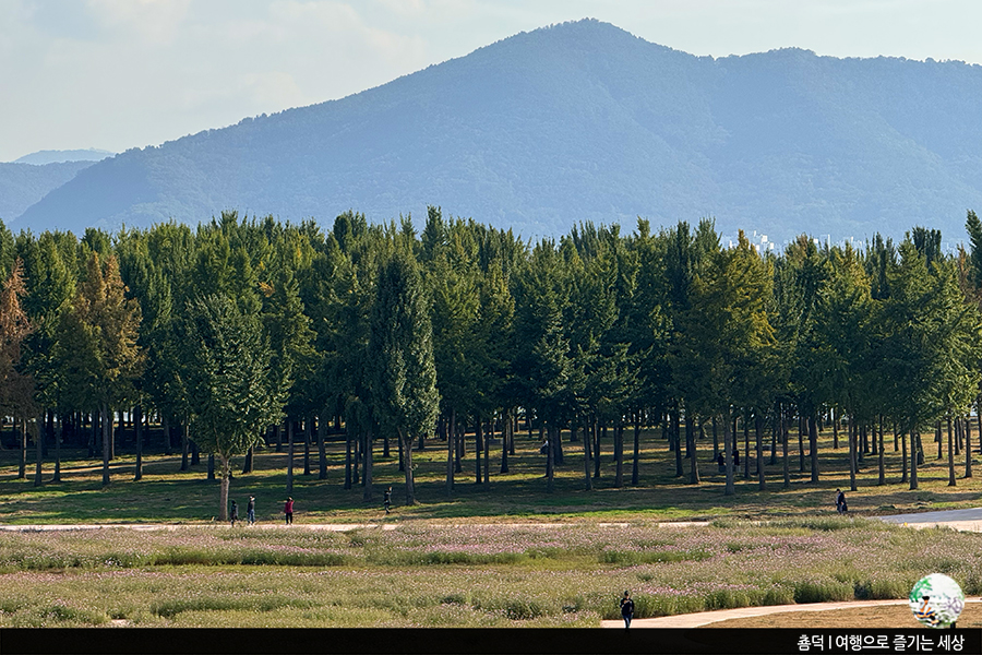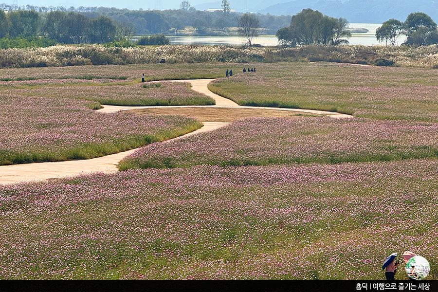 역시! 위에서 내려다보는 장면이 가장 멋지다. 알록달록 예쁘게 핀 코스모스와 노란 물결을 일으키며 흔들리는 갈대, 그리고 저 멀리 낙동강의 풍경까지! 만약 고령 다산 은행나무숲을 방문한다면 전망대에서 전체를 감상하길 추천한다.