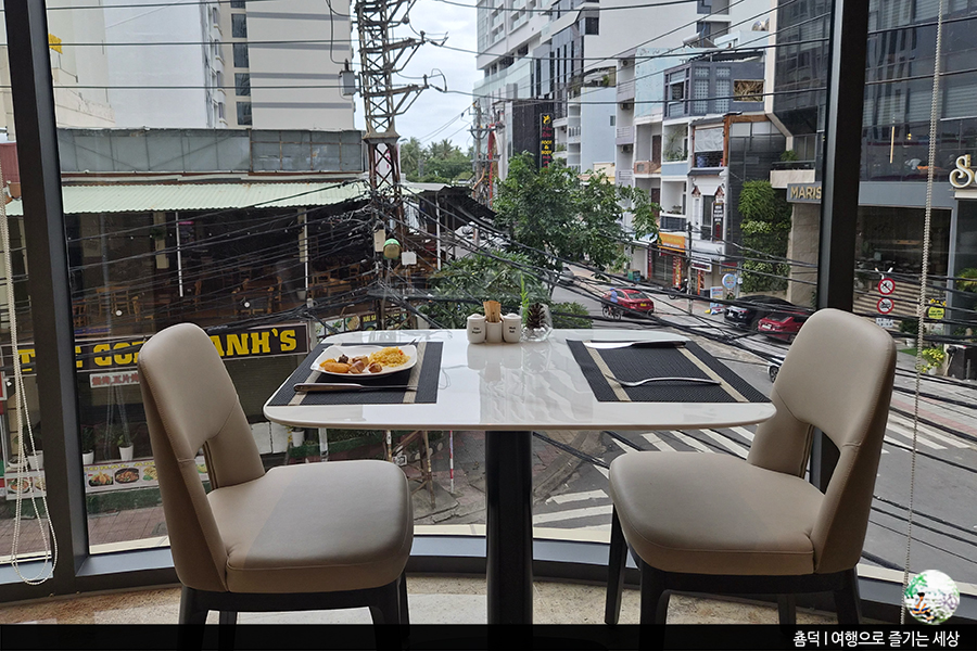 이번 여행에서 숙소는 두 곳에 머물렀는데요, 처음에 머문 호텔은 나트랑 시내에 있는 <아다마스 부티크 호텔 나짱>입니다. 여행 시작 아침, 호텔 레스토랑에서 조식으로 베트남 나트랑 여행의 첫끼를 먹어봅니다. 창가에 앉으니 동남아시아의 흔한 풍경 중 하나인 전깃줄이 가득한 도심의 풍경이 보여요.