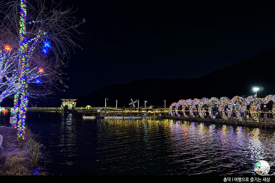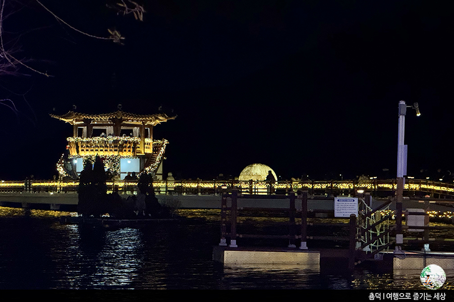 옥연지 위 데크를 따라 백세정까지 예쁜 조명이 이어져 있어요. 평소라면 데크를 따라 걸으며 백세정까지 갔겠지만, 오늘은 다가갈 엄두가 나지 않았어요. 25년 대구의 크리스마스는 한파와 강풍으로 송해공원은 정말 상상이상으로 추웠거든요.