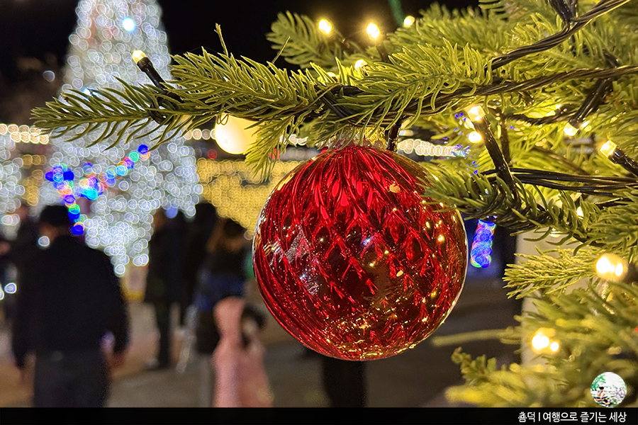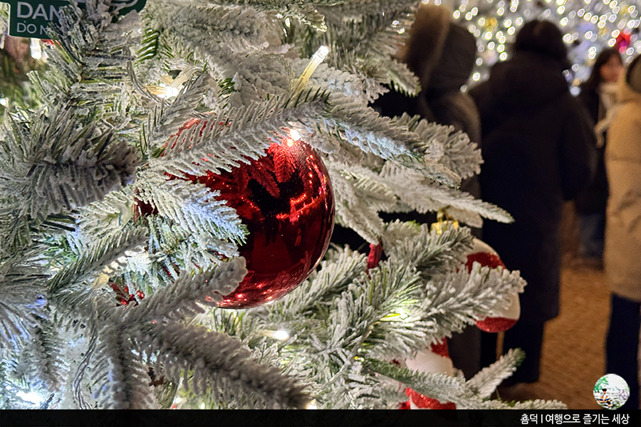 트리가 더욱 예쁜 이유는 색감 때문인 듯 했어요. 녹색가지가 아닌 이 녹색 위에 눈이 내린 듯 하얗게 덮인 잎 주변으로 장식과 조명이 트리를 한층 더 예쁘게 만들어주더라고요. 마치 눈이 내린 산타마을을 연출해 둬 크리스마스 분위기를 더 느낄 수 있었답니다.