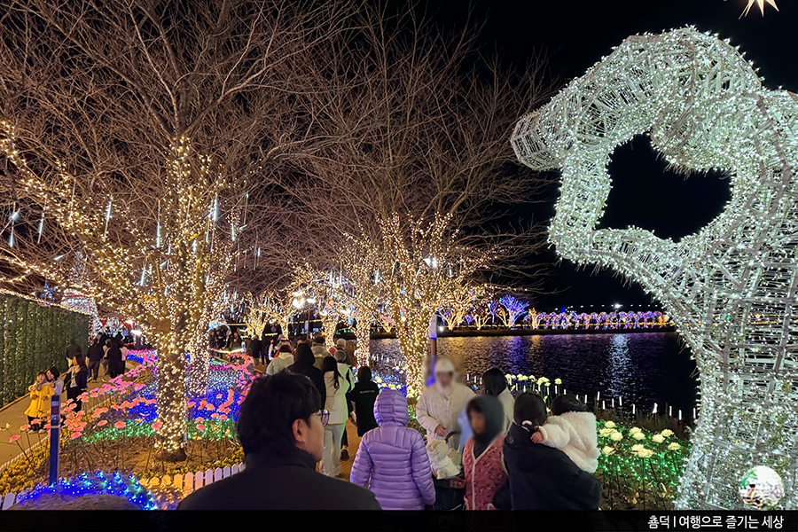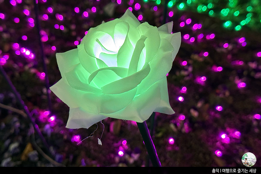 마법터널을 지나갔다면 돌아올 땐 터널 옆 길을 따라 걸어봤어요. 옥연지 옆으로 꽃 모형의 조명들이 산책로를 장식해두고 있었어요. 터널을 걷는 것도 좋지만, 예쁜 꽃 조명들을 보며 걸을 수 있어 이 또한 다른 재미가 있더라고요.