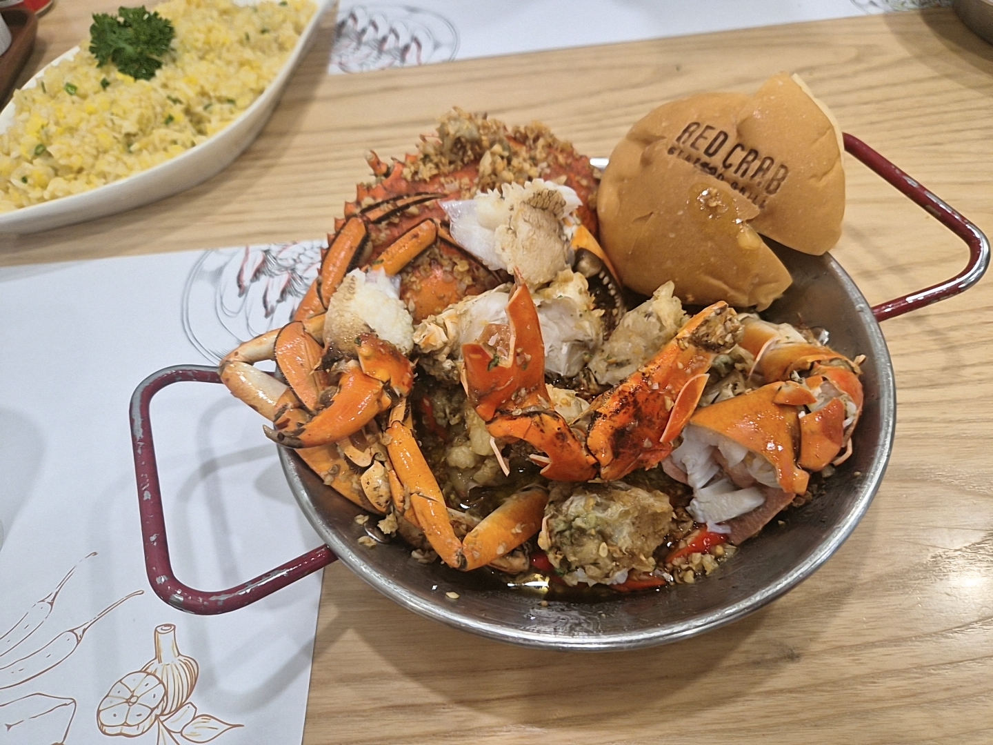 잠시 후 게 주문한 메뉴들이 하나씩 올라왔어요. 저희는 게 2마리와 함께 볶음밥을 주문했어요. 레드크랩의 메뉴인 갈릭버터와 칠리 크랩을 주문했거든요. 게를 먹으면서