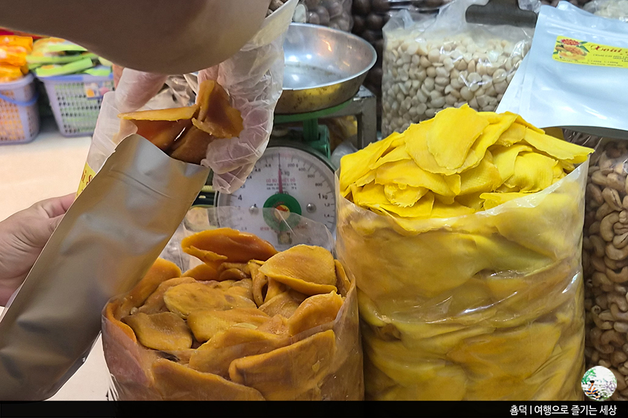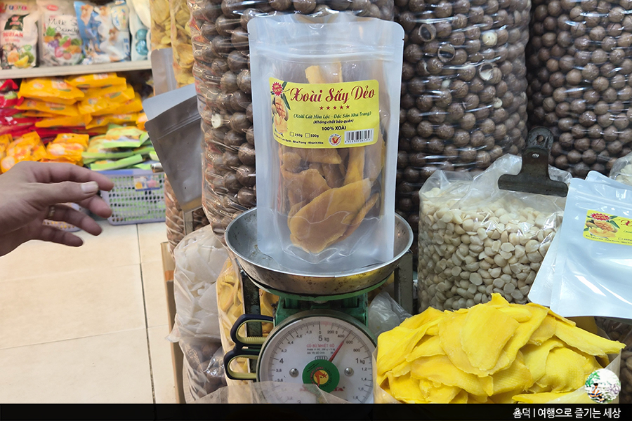 직원이 또박또박 한국말고 건망고 홍보를 해요. 정말 베트남어를 하나도 몰라도 쇼핑하는데 전혀 지장이 없어요. 알아서 다 해주거든요. 이집은 워낙 건망고를 많이 구입하다 보니 지퍼팩이 달린 봉투도 따로 주더라고요. 저울에 무게를 확인하며 건망고 500그램씩 나눠 담아 줬어요.